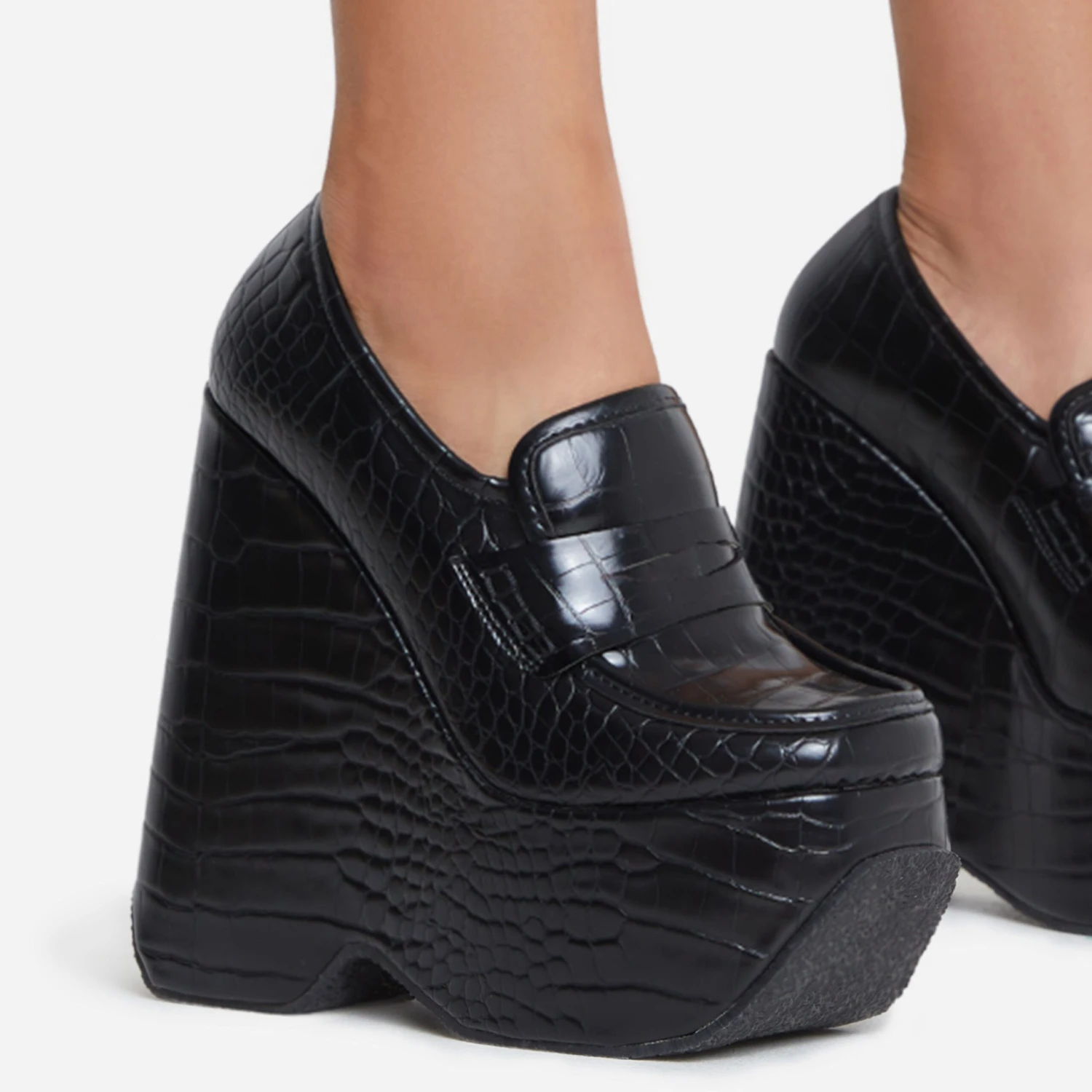 EGO A-New-Day Closed Square Toe Platform Wedge Loafer Heel In Black Croc Print Faux Leather