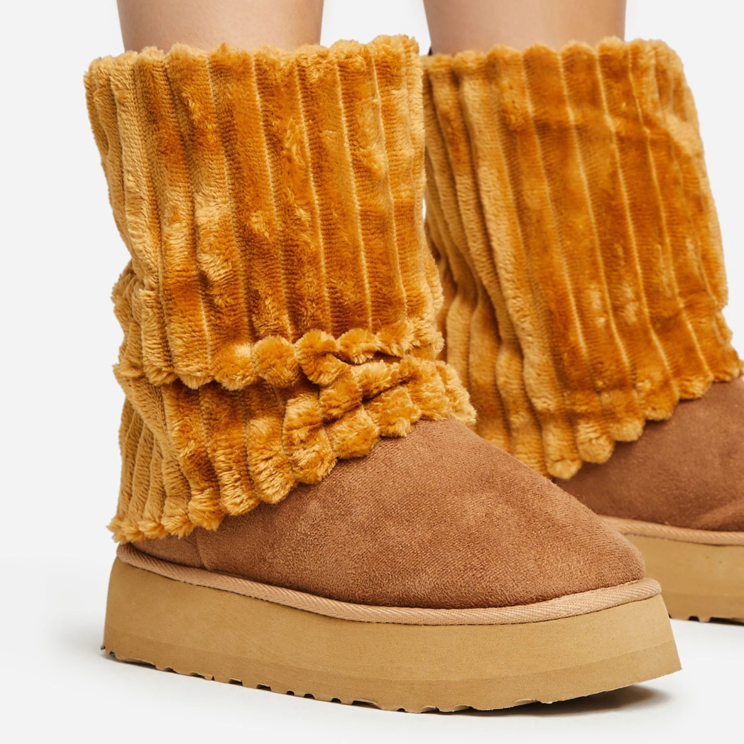 Elevate your casual look with these must have boots. Featuring a chestnut brown faux suede material, with layered detailing, a platform sole and an ankle length.