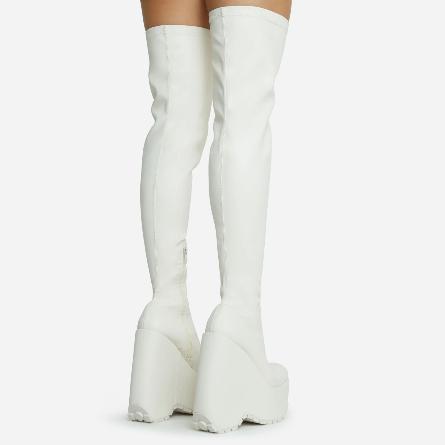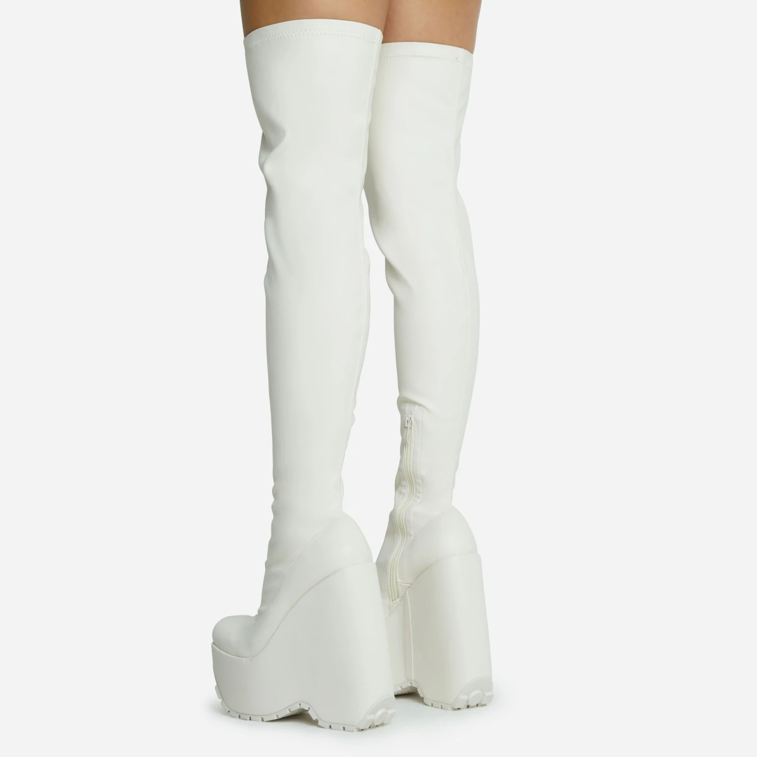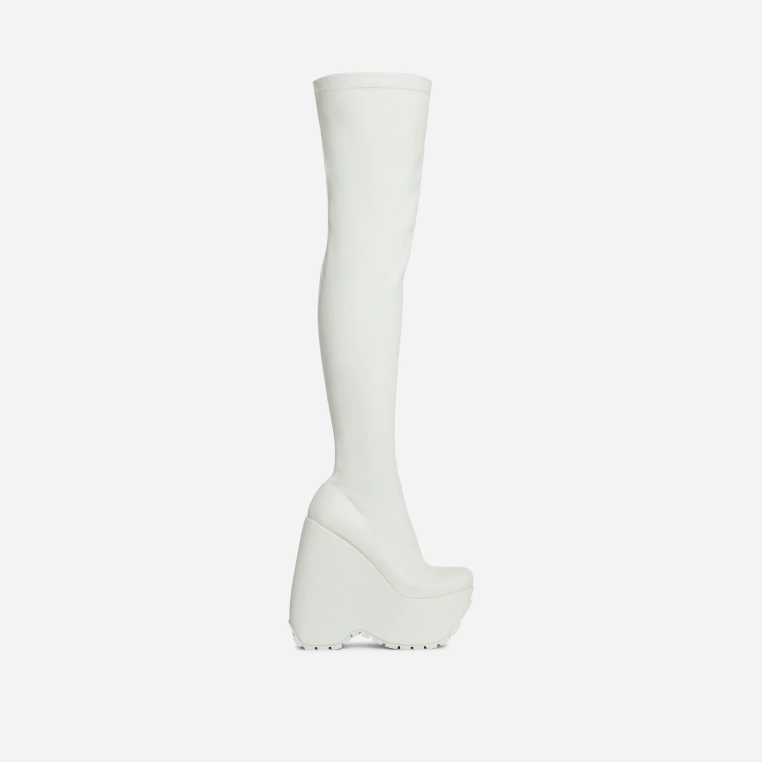 Got a boujee night out on the cards? We’ve got your look covered. Featuring a cream faux leather material, with a chunky platform wedge and an over the knee thigh high length.