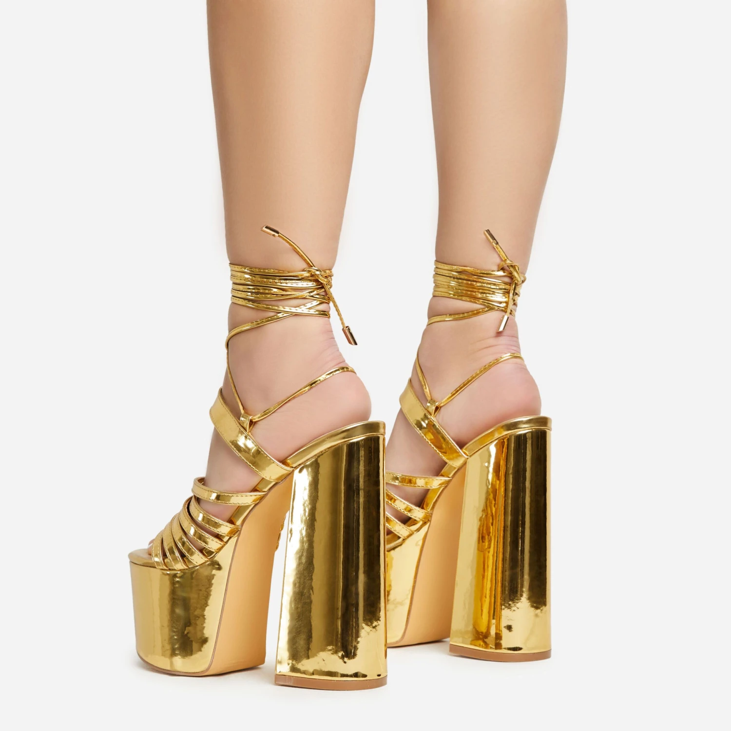 Gold heels are a staple in any doll’s wardrobe and we’re obsessed with these. Featuring a gold patent material, an extreme platform heel, strappy detailing and a lace-up design.