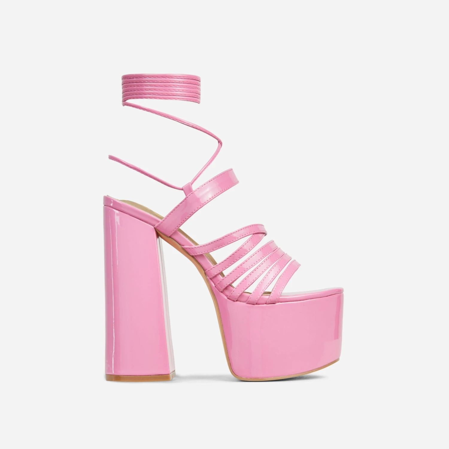 Add a pop of pink to your OTTD with these heels doll. Featuring a pink patent material, an extreme platform heel, strappy detailing and a lace-up design.