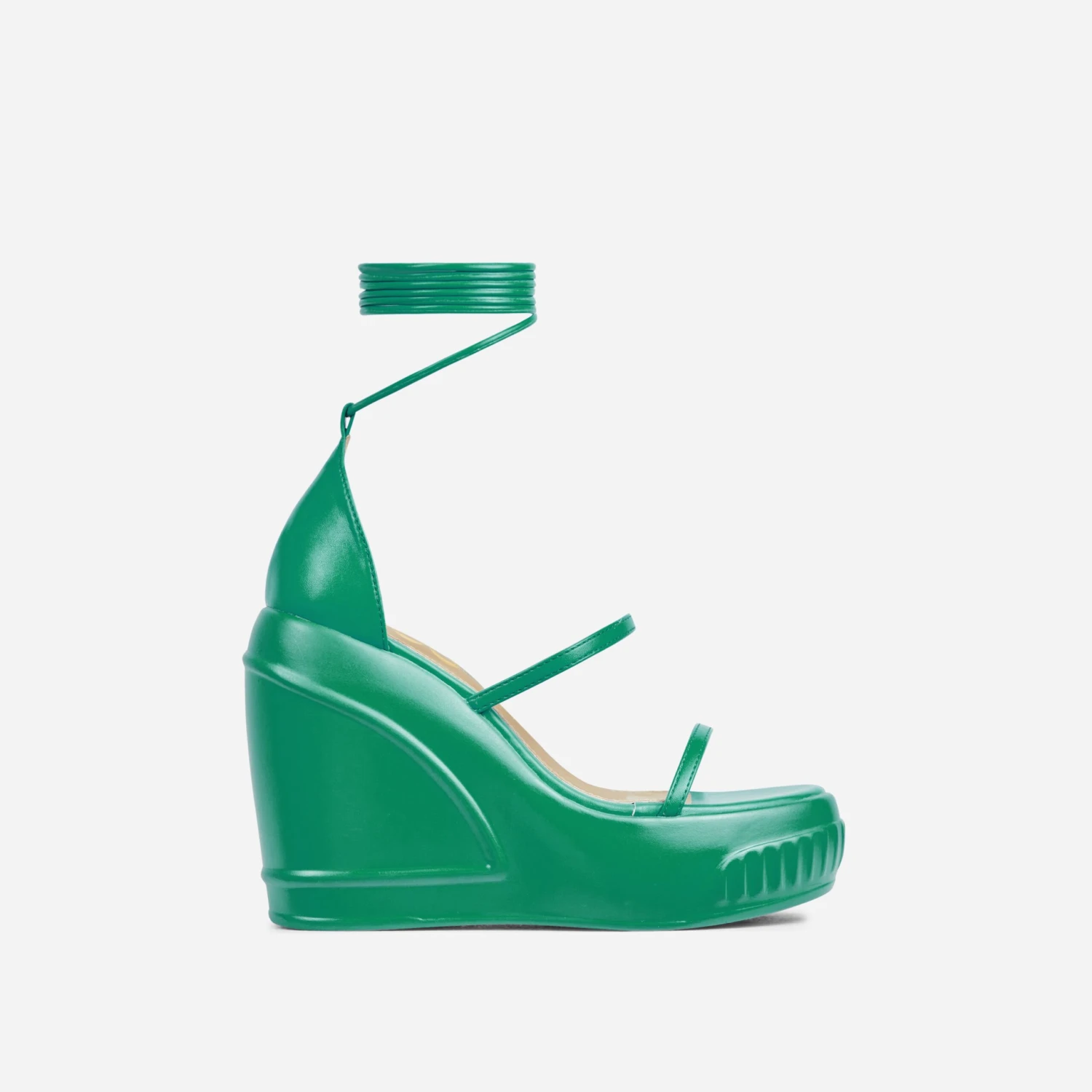 Add some colour to your finished look doll. Featuring a green faux leather and rubber material, with strappy detailing, a platform wedge heel and a lace up finish.