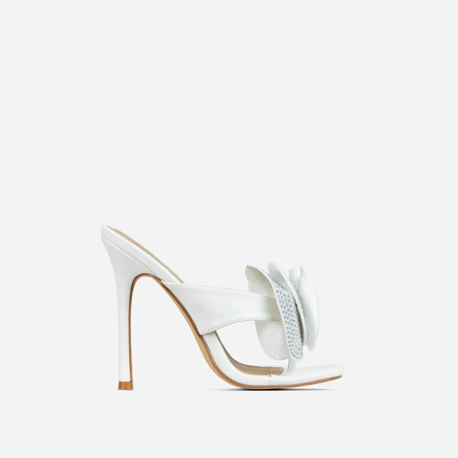We’re obsessed with these mules doll. Featuring a white faux leather material, an oversized diamante rose detail, a thong strap and a stiletto heel.