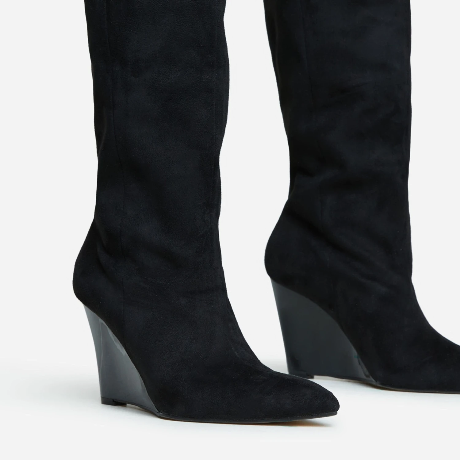 A black knee high boot is a must have in any doll’s wardrobe. Featuring a black faux suede material, a pointed toe, a wedge heel and a knee high length.
