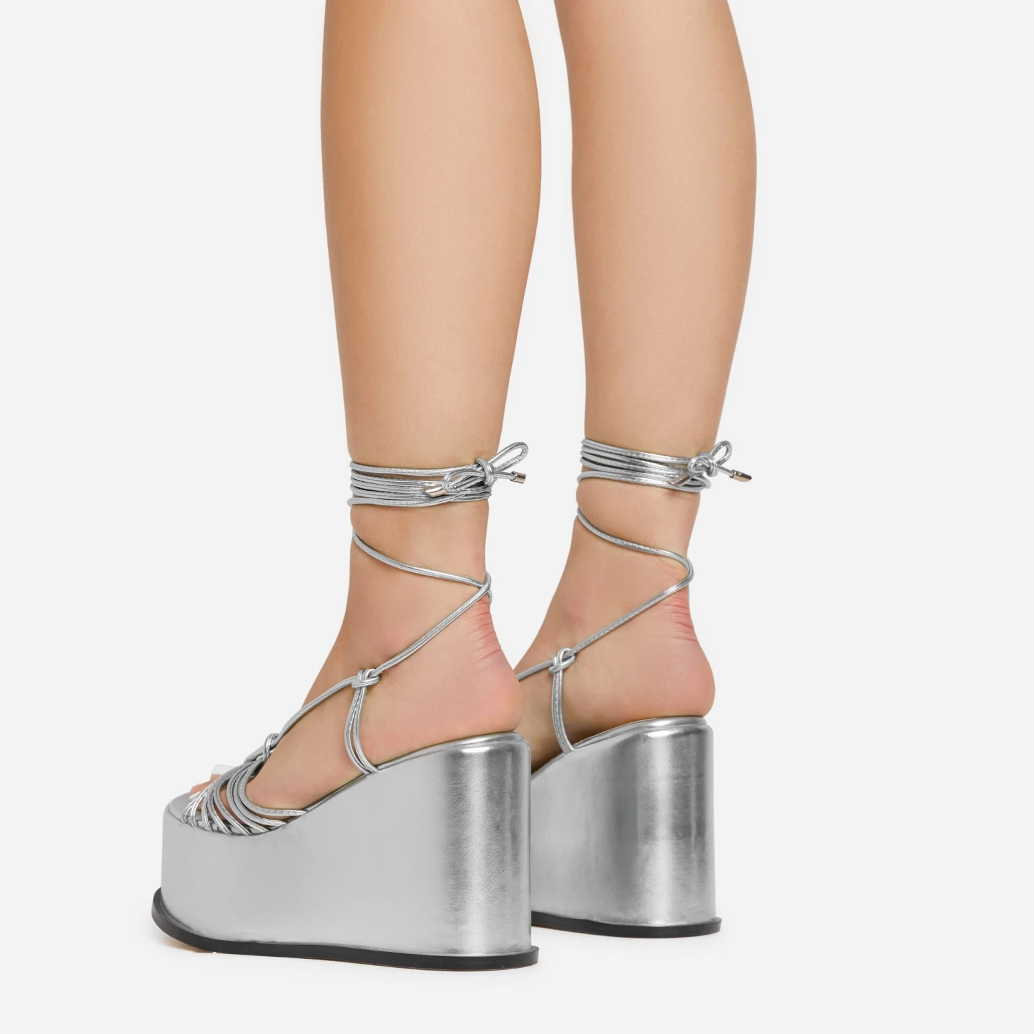 Strut into the weekend with these heels doll. Featuring a silver metallic faux leather material, a lace-up knotted strap detail and a platform wedge heel.