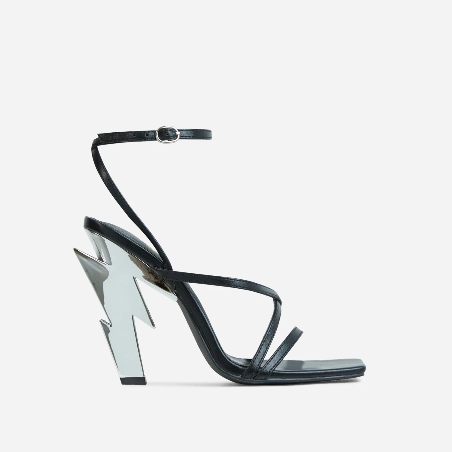 Have all eyes on you in these new season heels. Featuring a black faux leather material, with strappy detailing, a square toe and a statement lightning bolt heel.