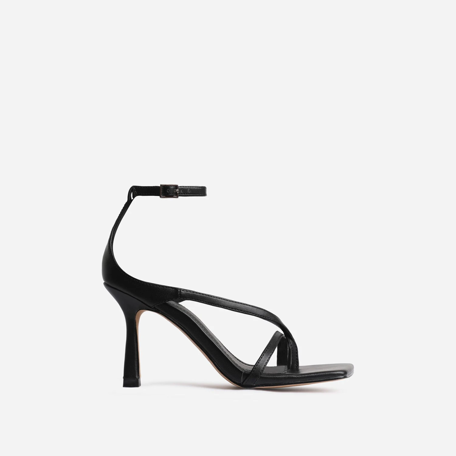 Don’t miss out on these sell outs. Eve features low stiletto heel, strappy upper, square toe and black faux leather finish.