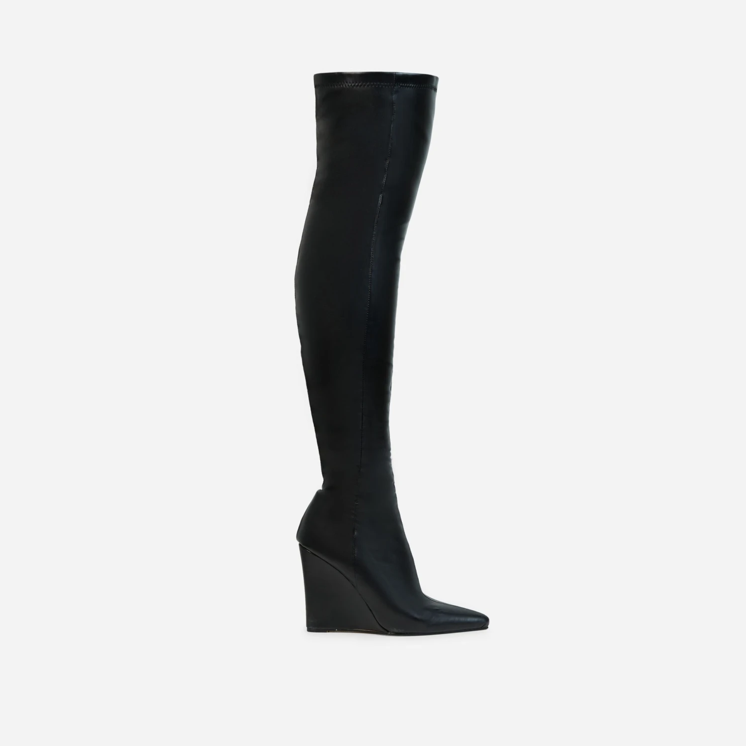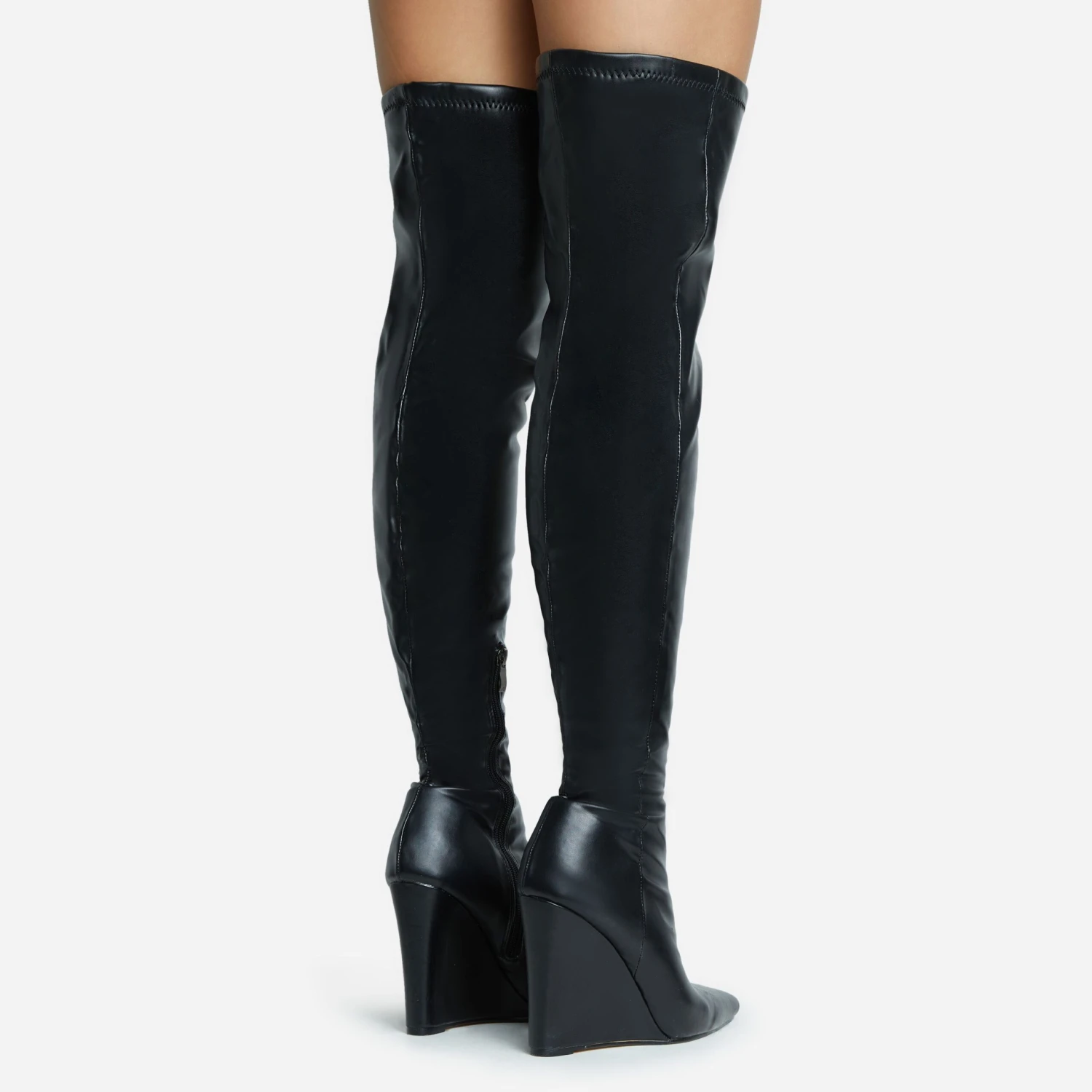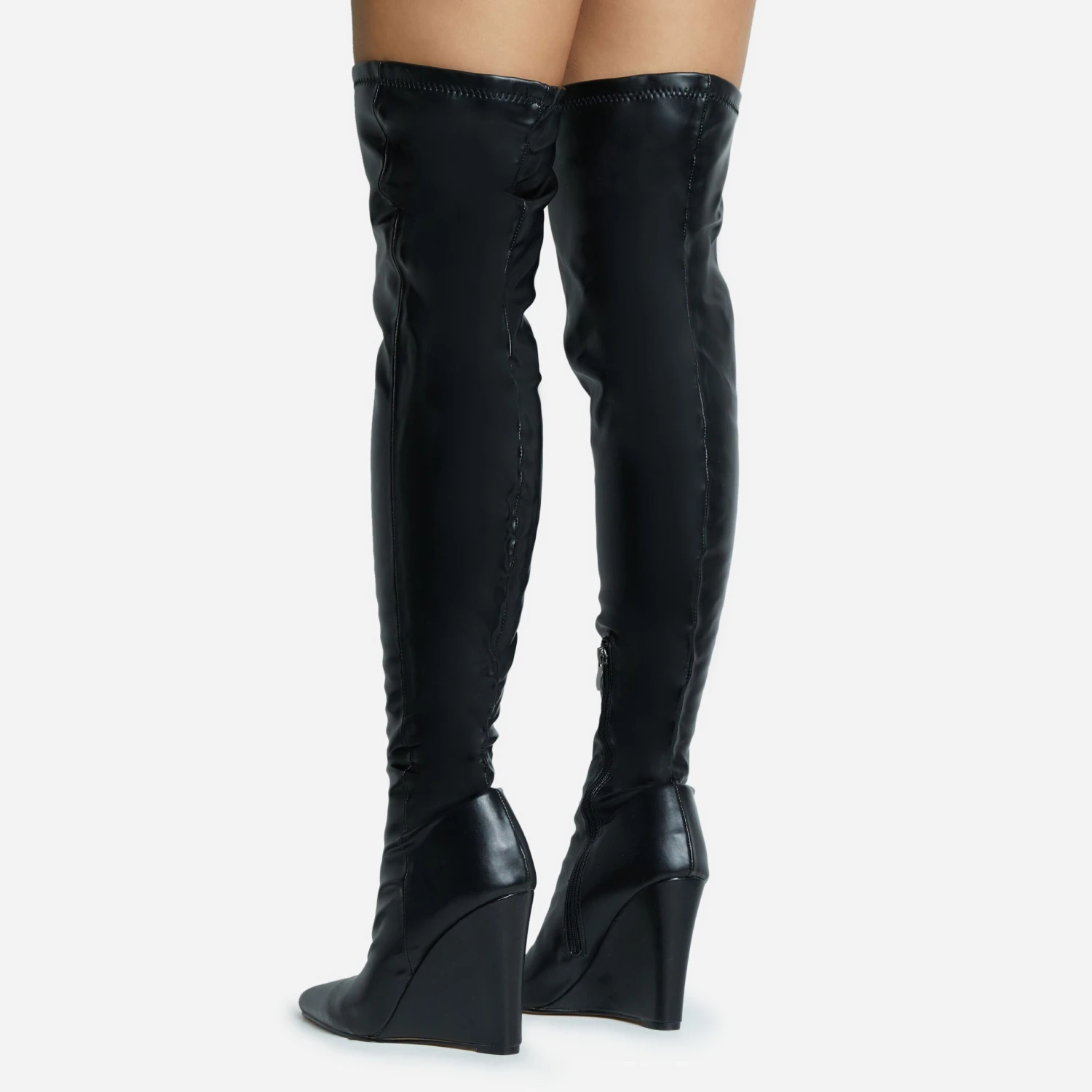 Girl, have all eyes on you in brand new EGO. Featuring a black faux leather material, with a pointed toe, a wedge heel and an over the knee thigh high design.