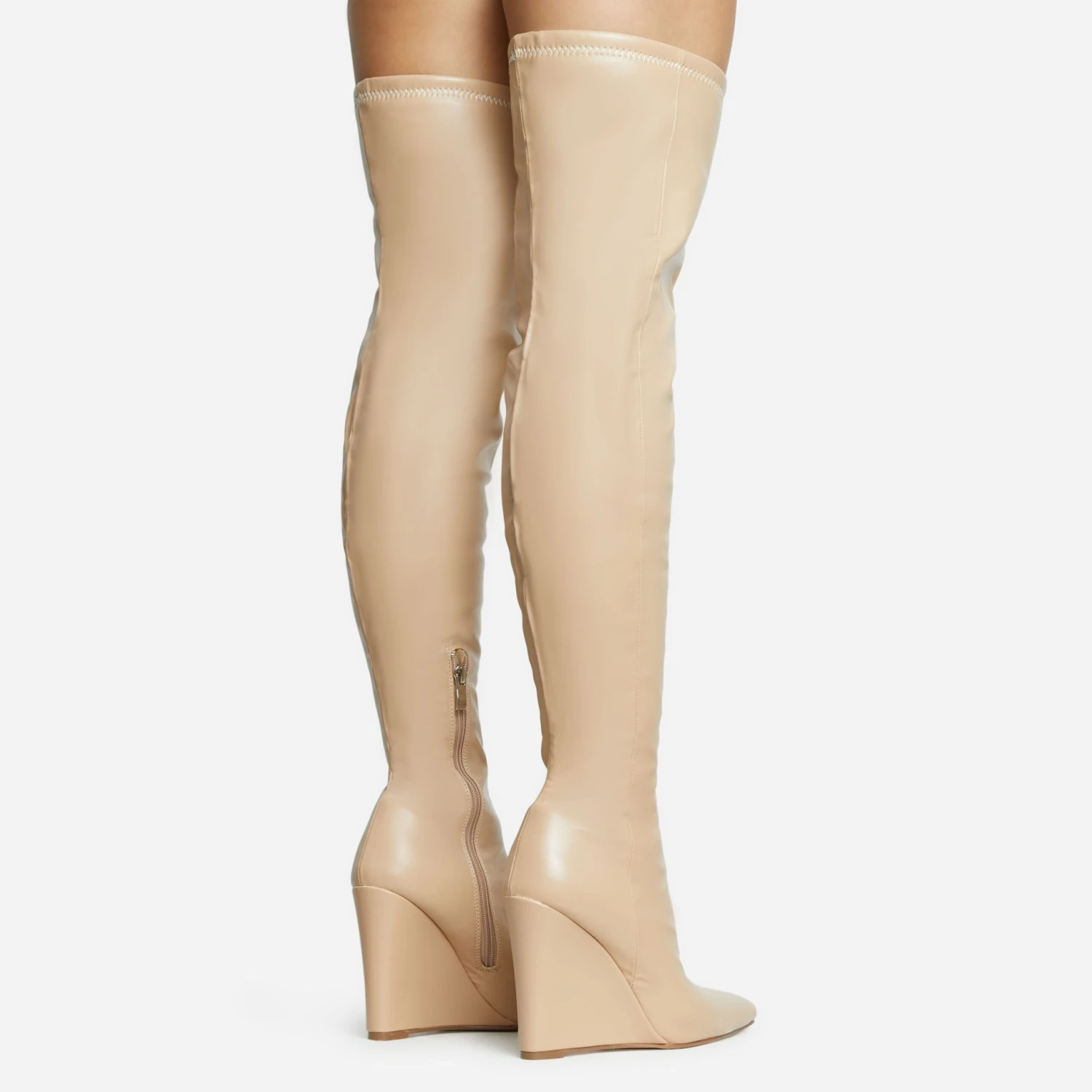 Love our other colourways? Then you’re sure to love these doll. Featuring a nude faux leather material, a pointed toe, a wedge heel and a thigh high length.