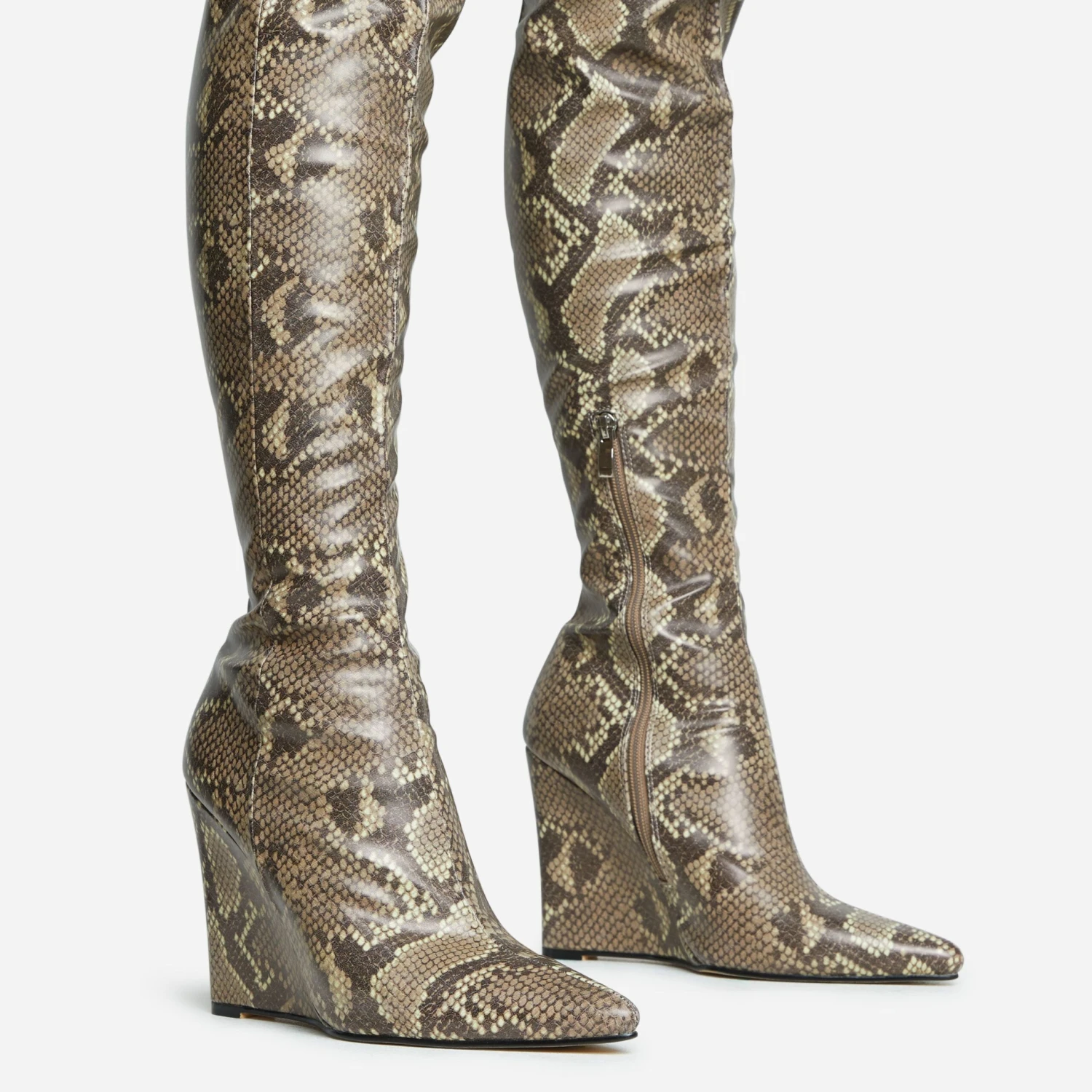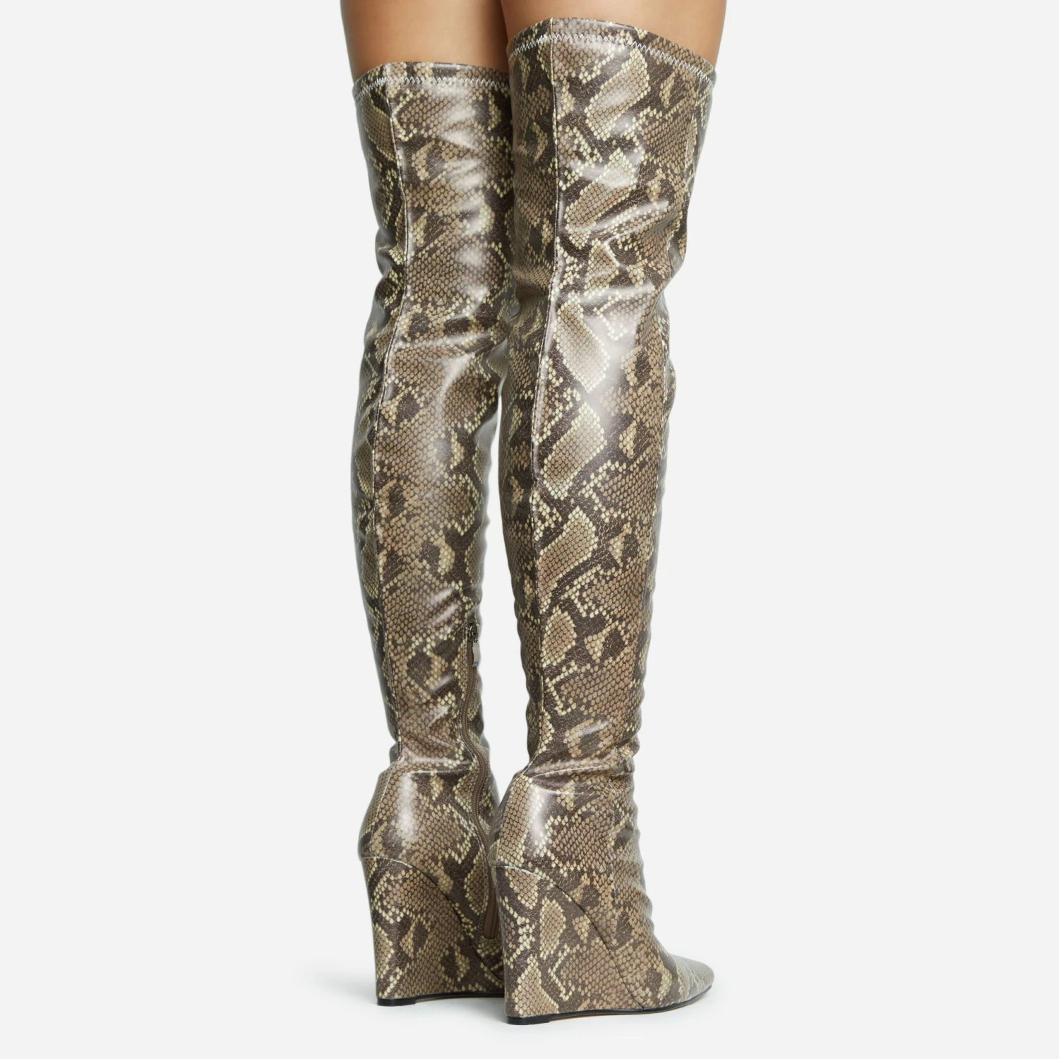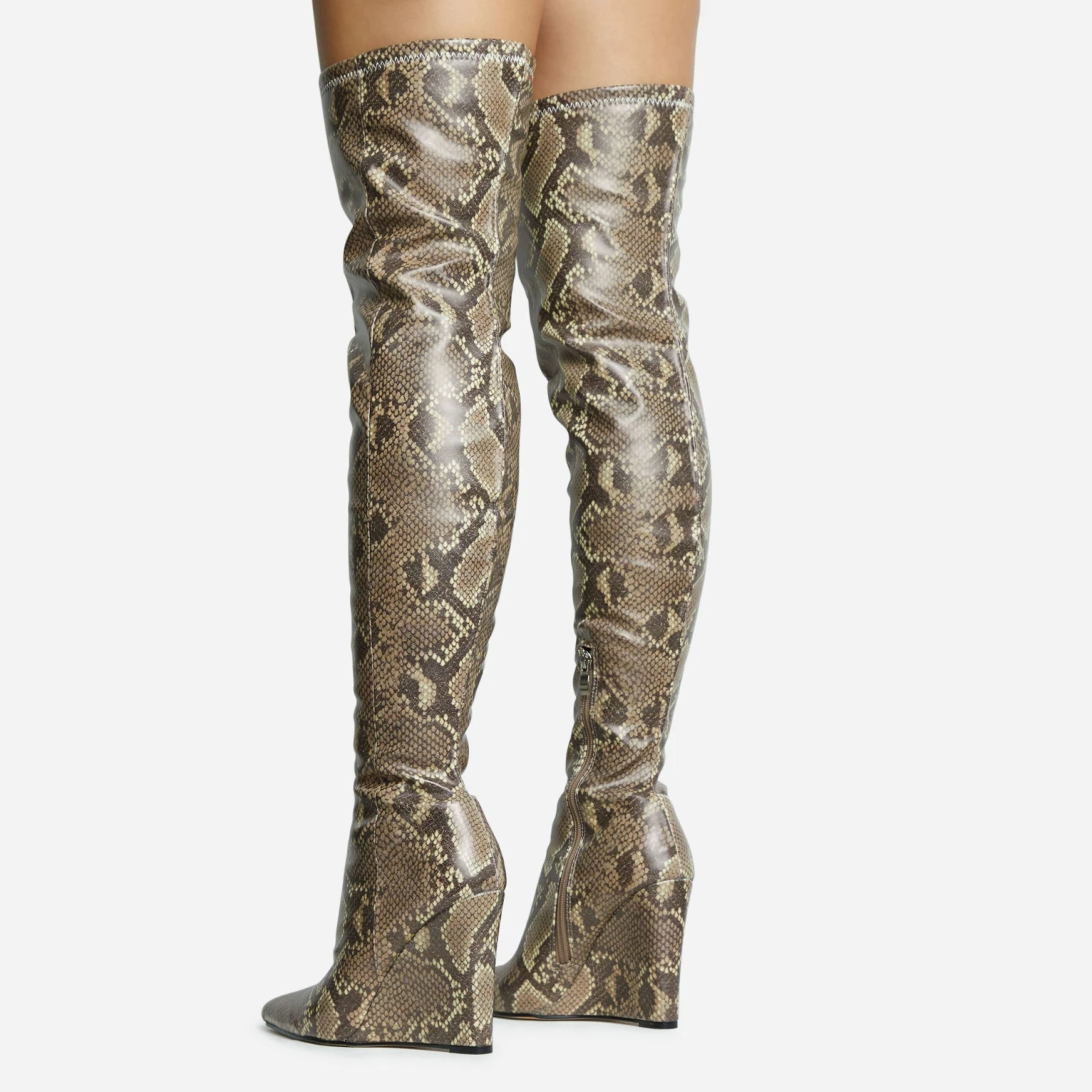 Work some prints into your outfit with these boots doll. Featuring a snake print faux leather material, a pointed toe, a wedge heel and a thigh high length.