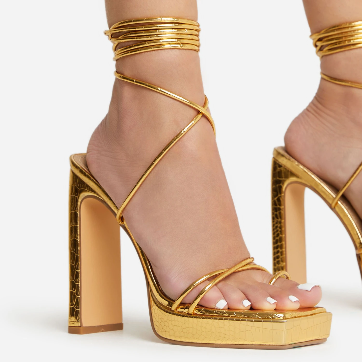 Get yourself noticed in these dreamy heels doll. Featuring a gold croc print faux leather material, with strappy detailing, a platform thin block heel and a lace up finish.