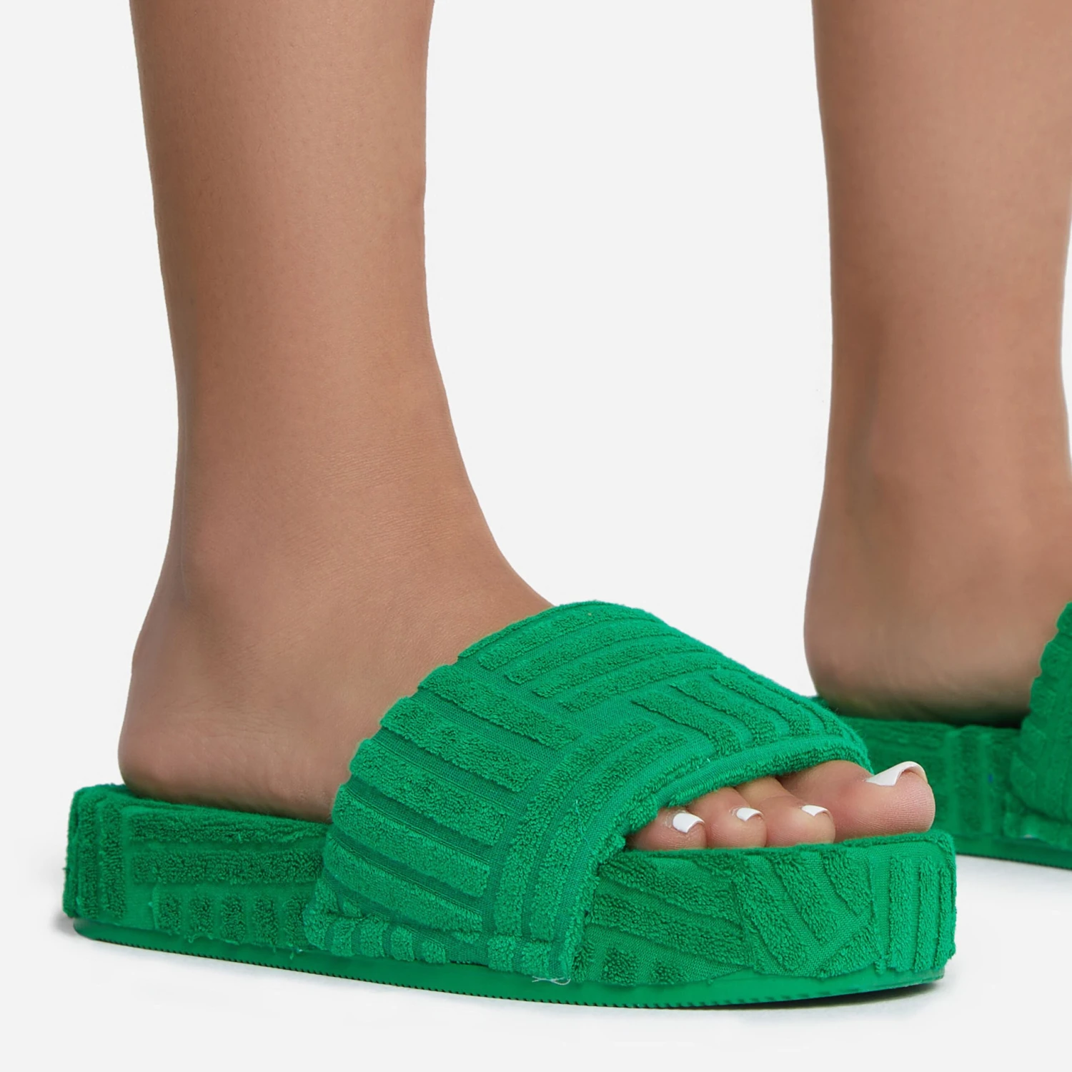 This season’s must-have sliders have officially dropped. Featuring a green material, with terry towel detailing, a flatform sole and a slip-on design. We are obsessed.