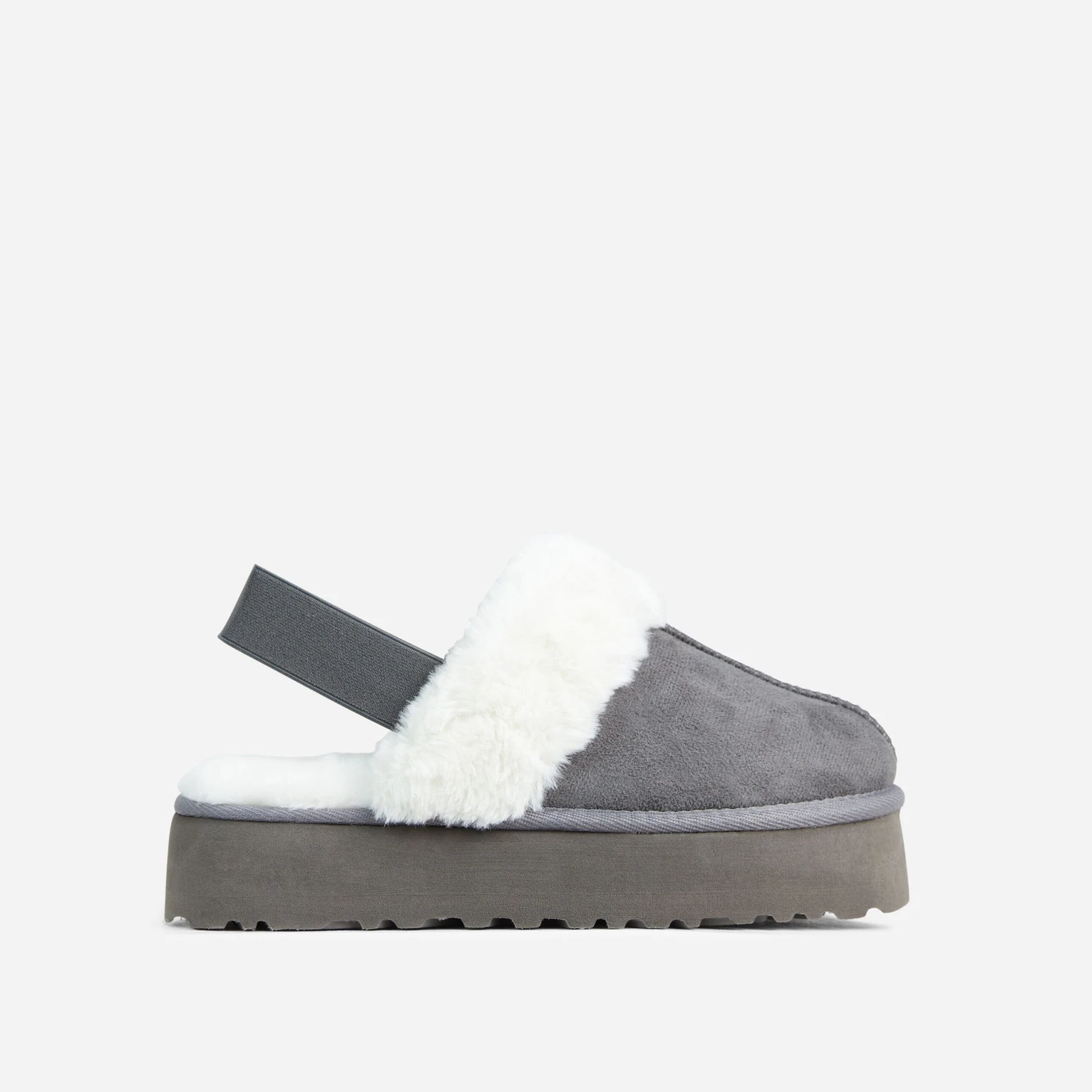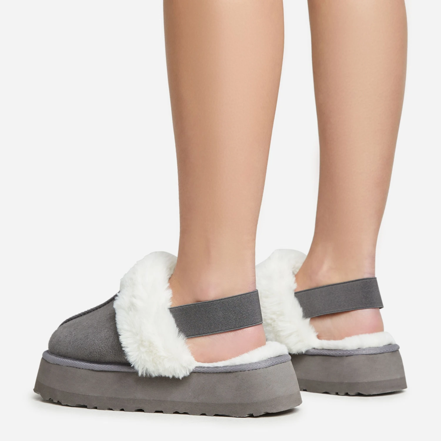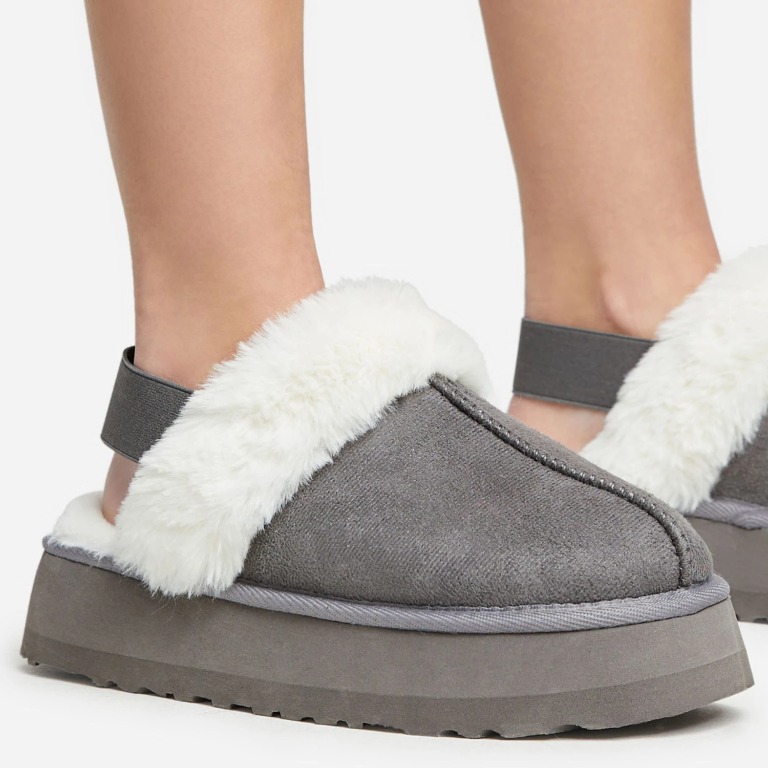 No January blues over here doll. Featuring a grey faux suede material, with faux fur trim detailing, a platform sole and a sling back slipper design.