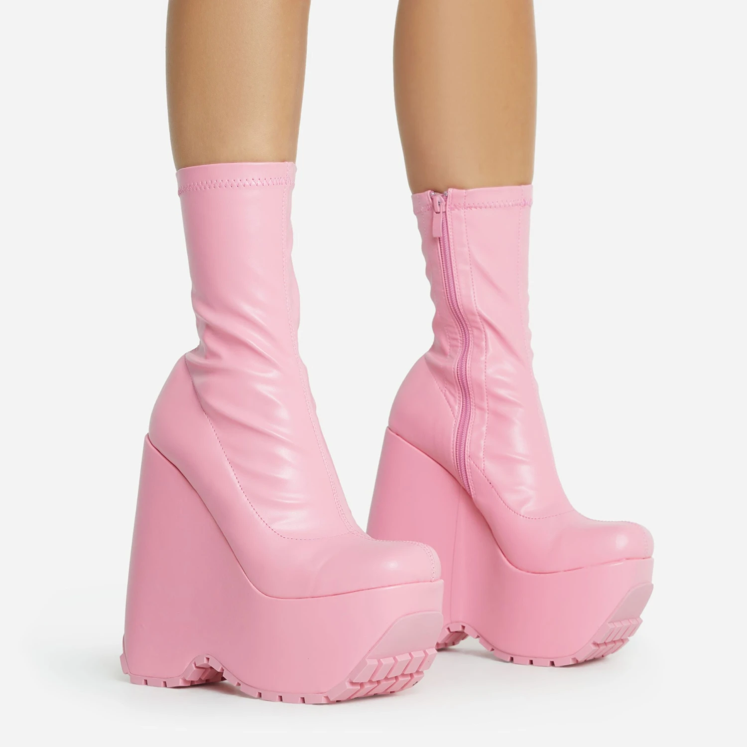 Add a pop of colour to your weekend look doll. Featuring a pink faux leather material, with a chunky platform wedge sole and an ankle sock boot design.
