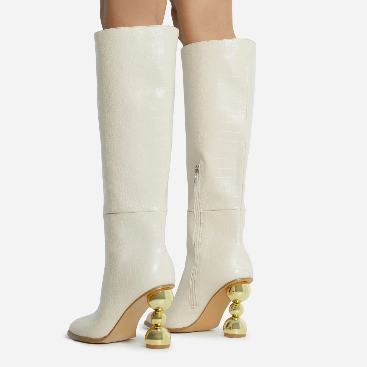 The perfect date night boots just landed and we are obsessed. Featuring a cream croc print faux leather material, with a statement metallic heel, a square toe and a knee high length.
