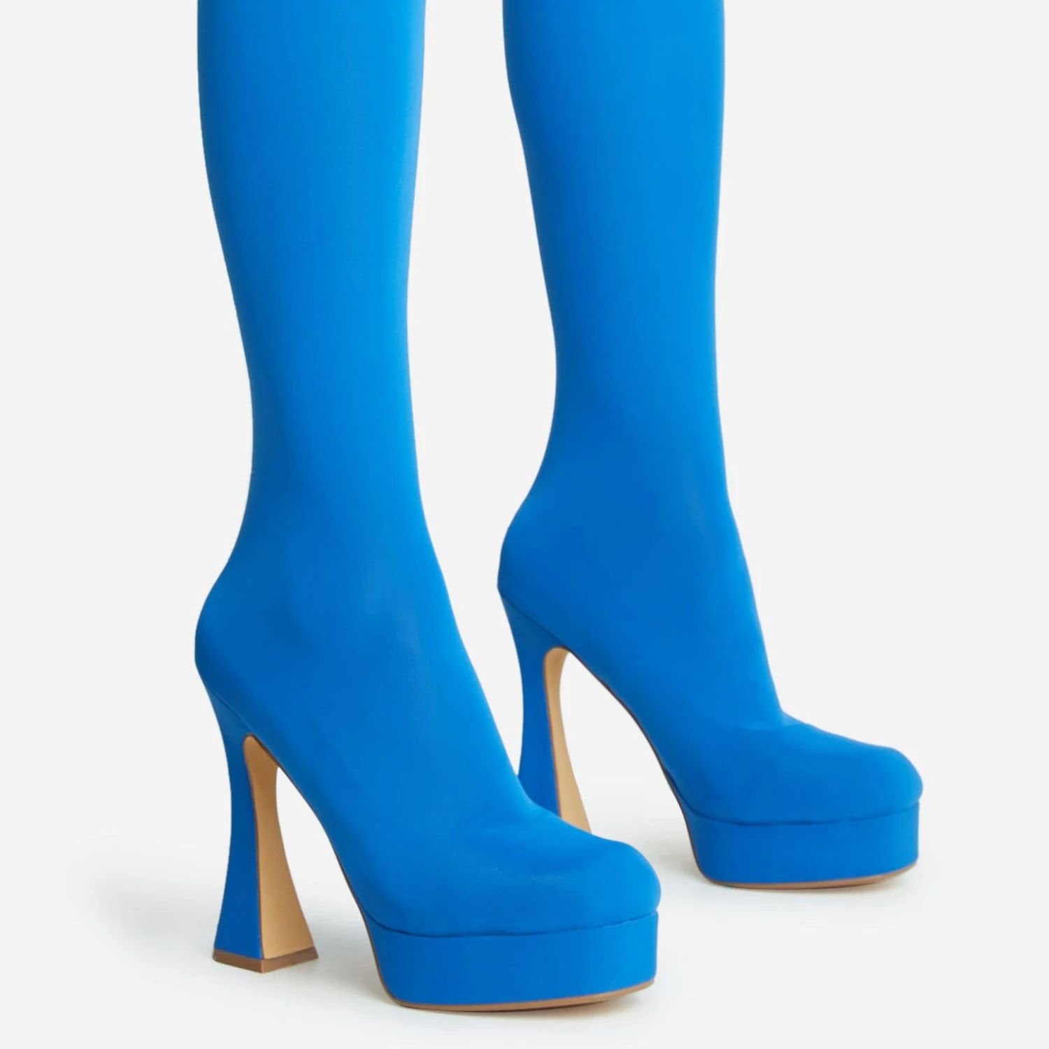 Have all eyes on you in EGO’s new season statement boots. Featuring a blue lycra material, with a platform sole, a flared block heel and a legging boot design.