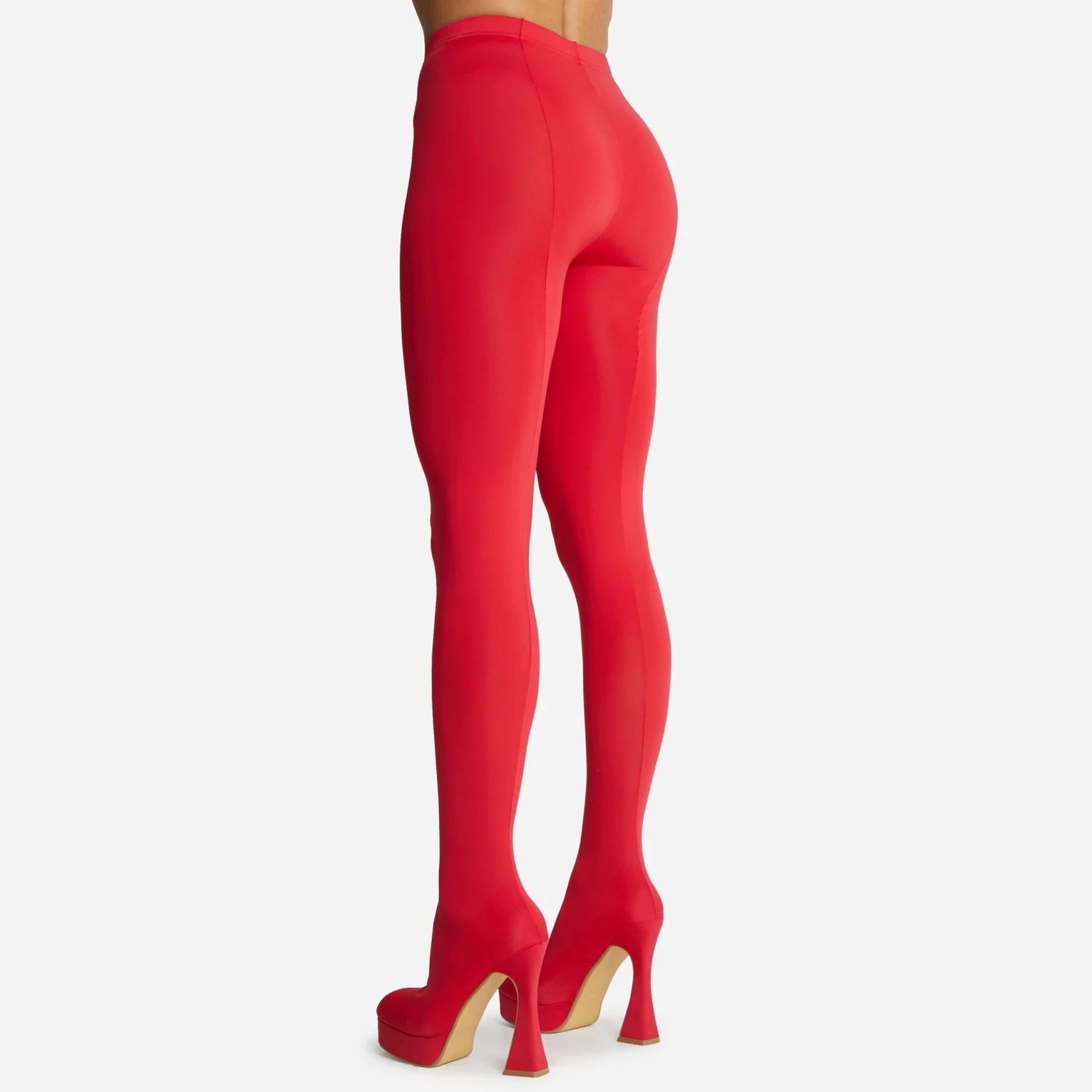 Add a fierce touch to your evening look doll. Featuring a red lycra material, with a platform sole, a flared block heel and a legging boot design.