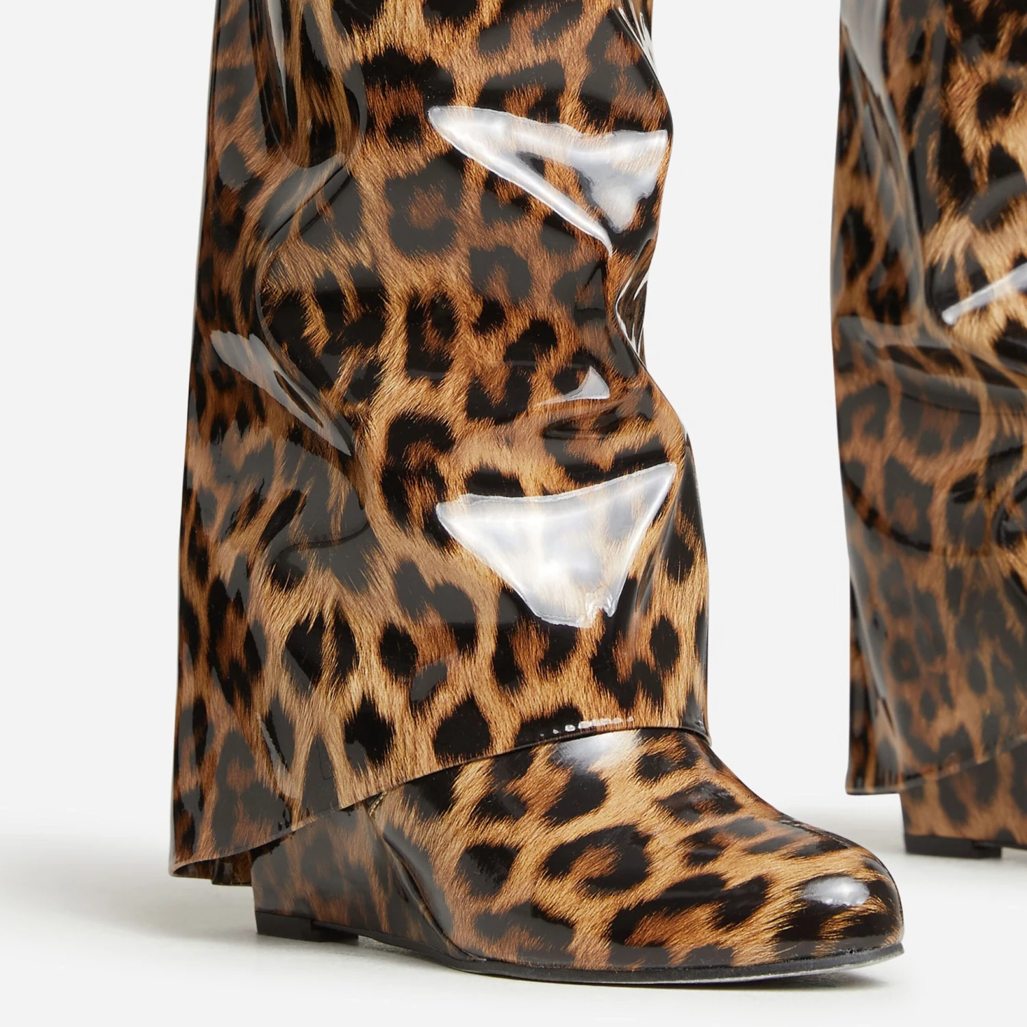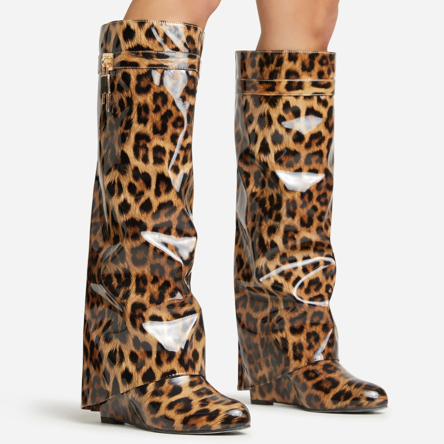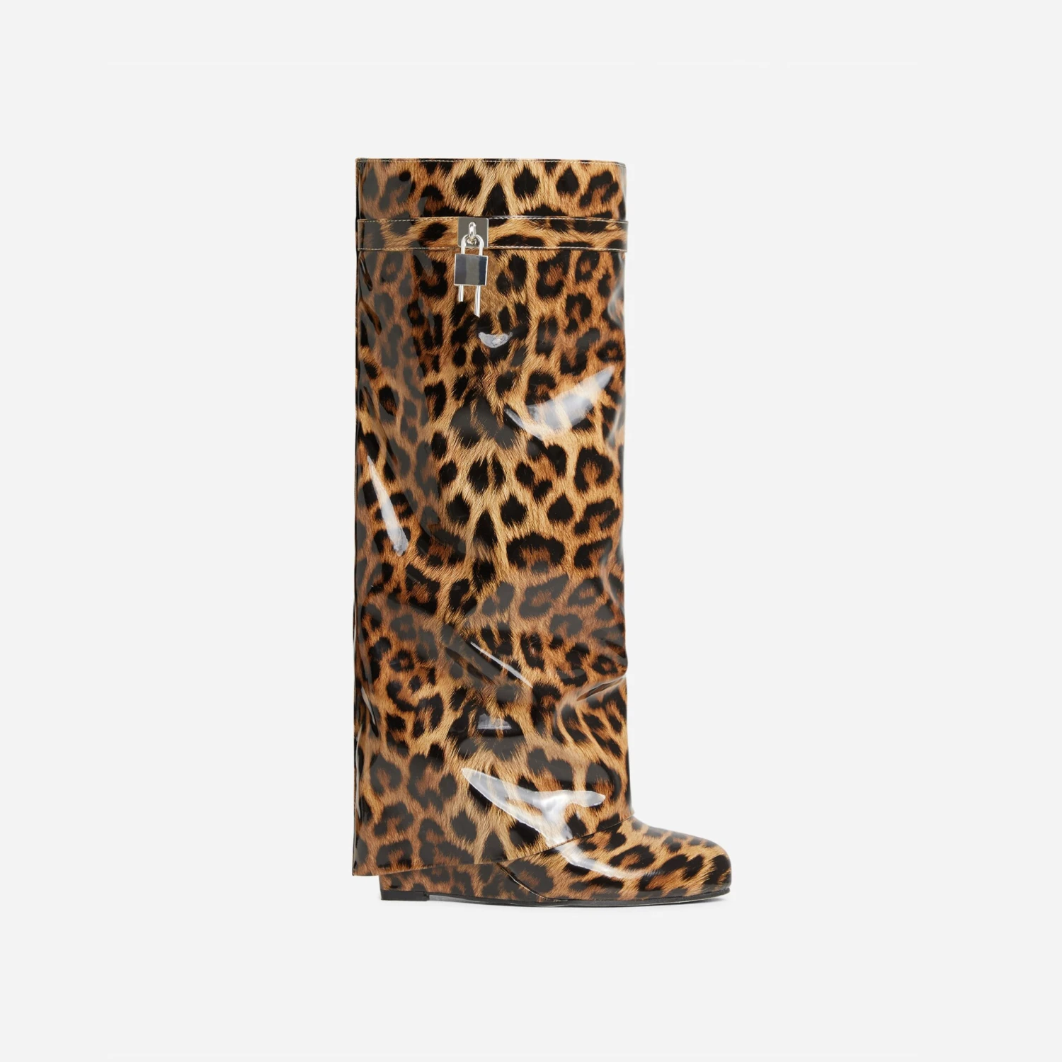 EGO I-Am-The-One Padlock Detail Wedge Heel Knee High Long Boot In Leopard Print Patent