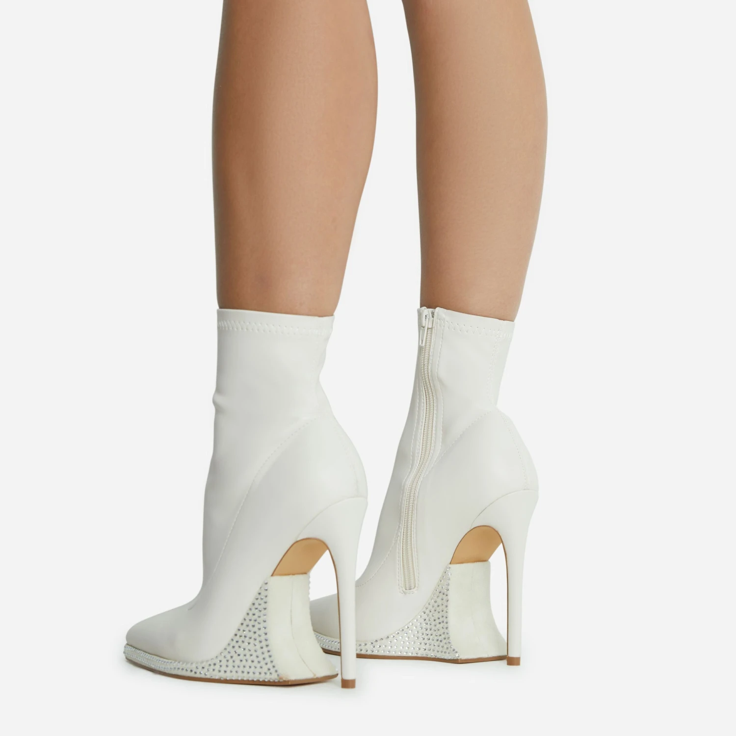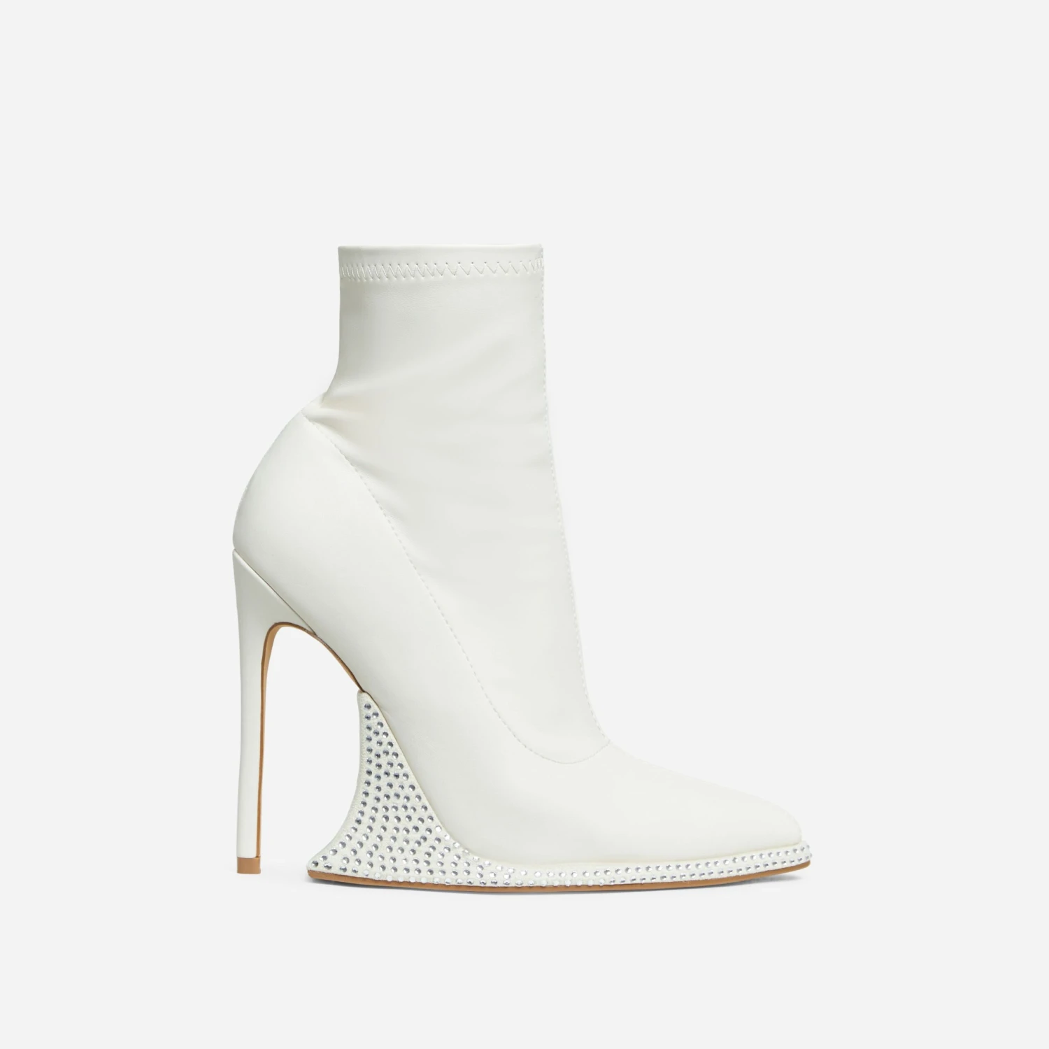 Update your neutrals doll. Featuring a cream faux leather material, with diamante detailing, a statement platform sole, pointed toe, stiletto heel and an ankle sock boot design.