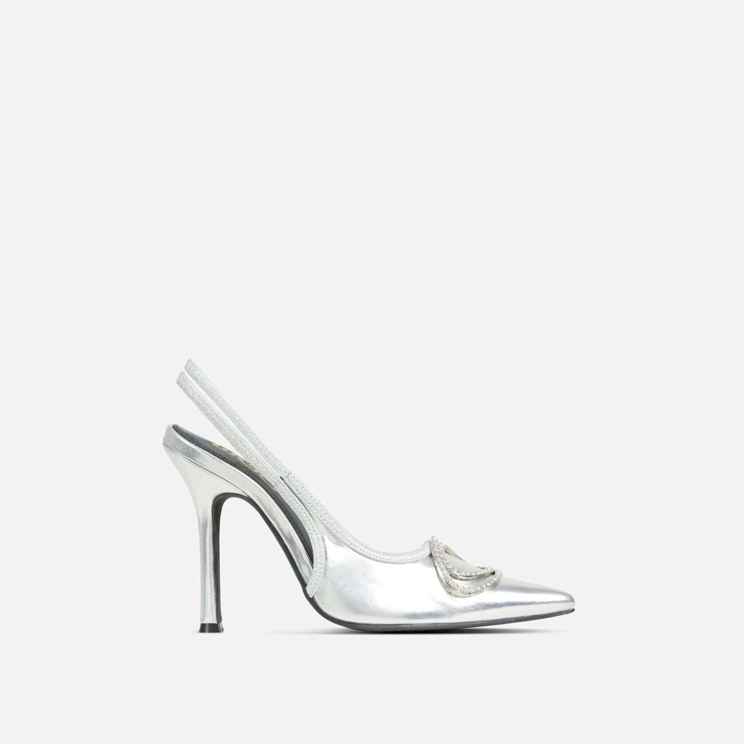 Stand out from the crowd in these dreamy heels. Featuring a silver faux leather material, with diamante detailing, a pointed toe and a slingback court heel design.