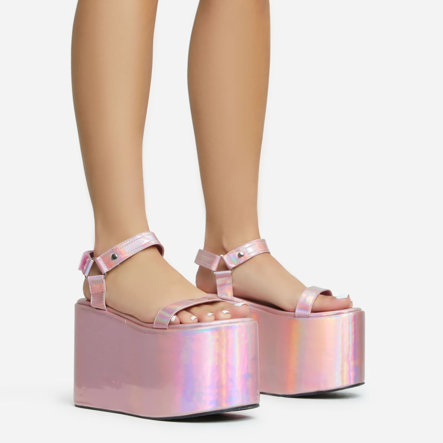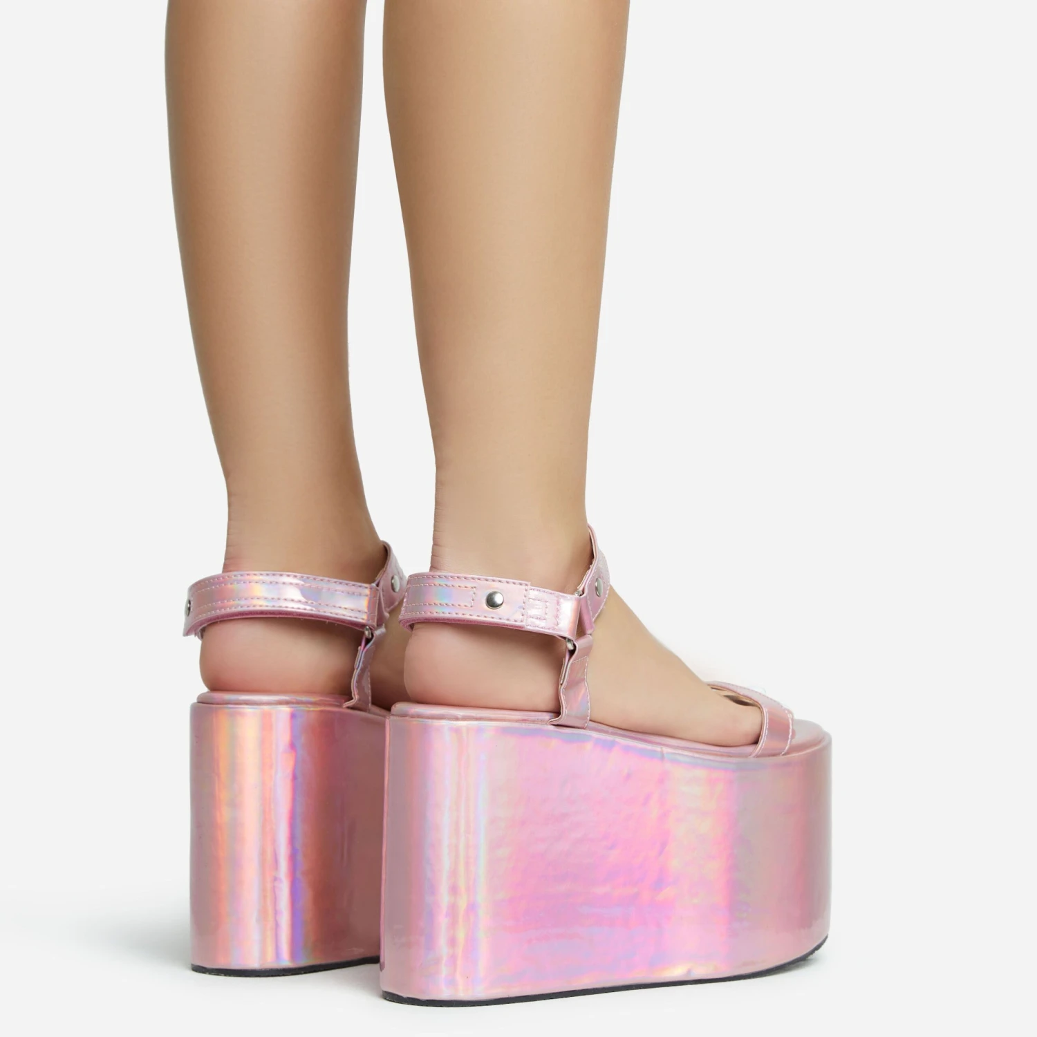 Strut your stuff with these wedges doll. Featuring a pink metallic faux leather material, a velcro strap detail and an extreme platform wedge.