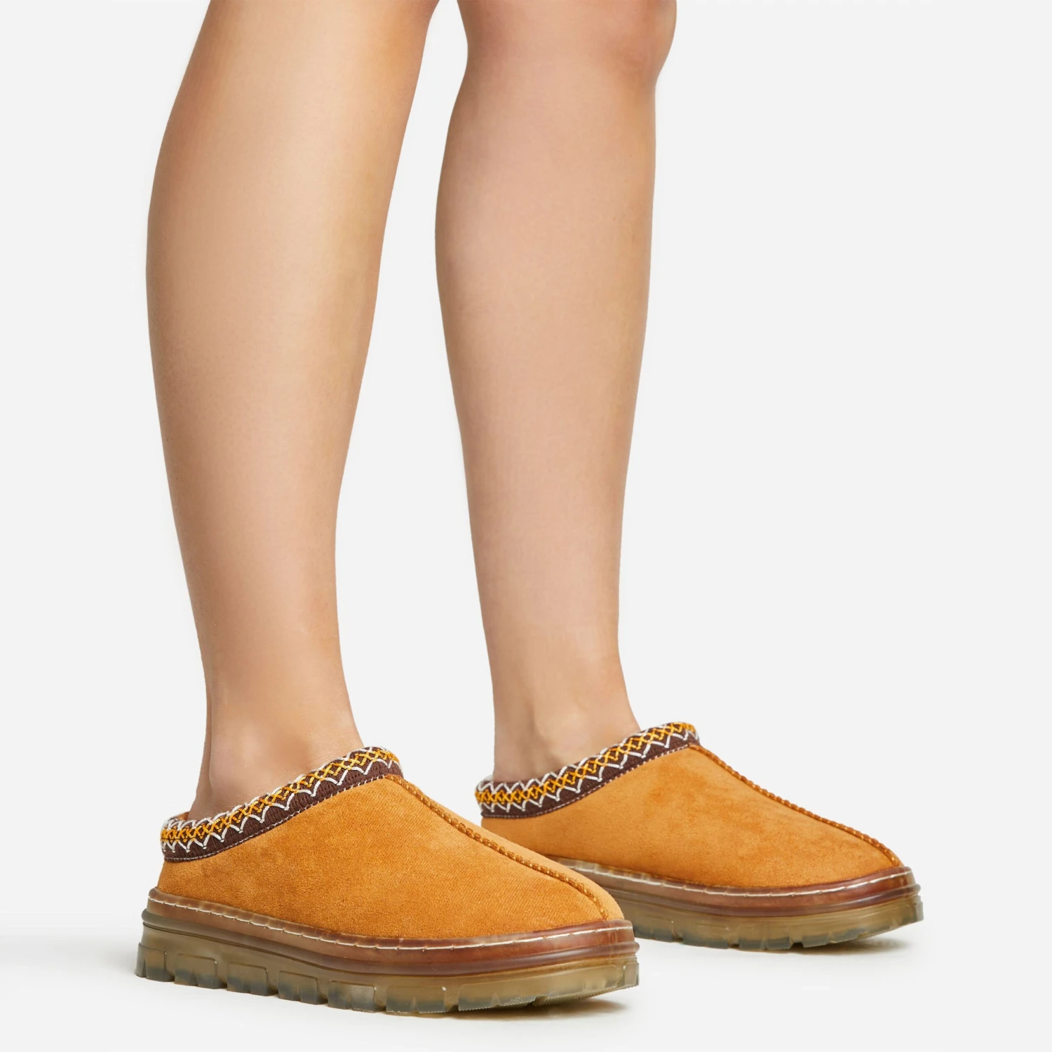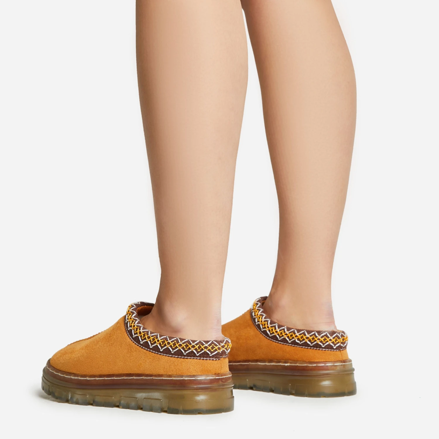Hit refresh on your new season look with these flats doll. Featuring a chestnut faux suede material, faux fur lining, a rubber sole and an aztec detailing.
