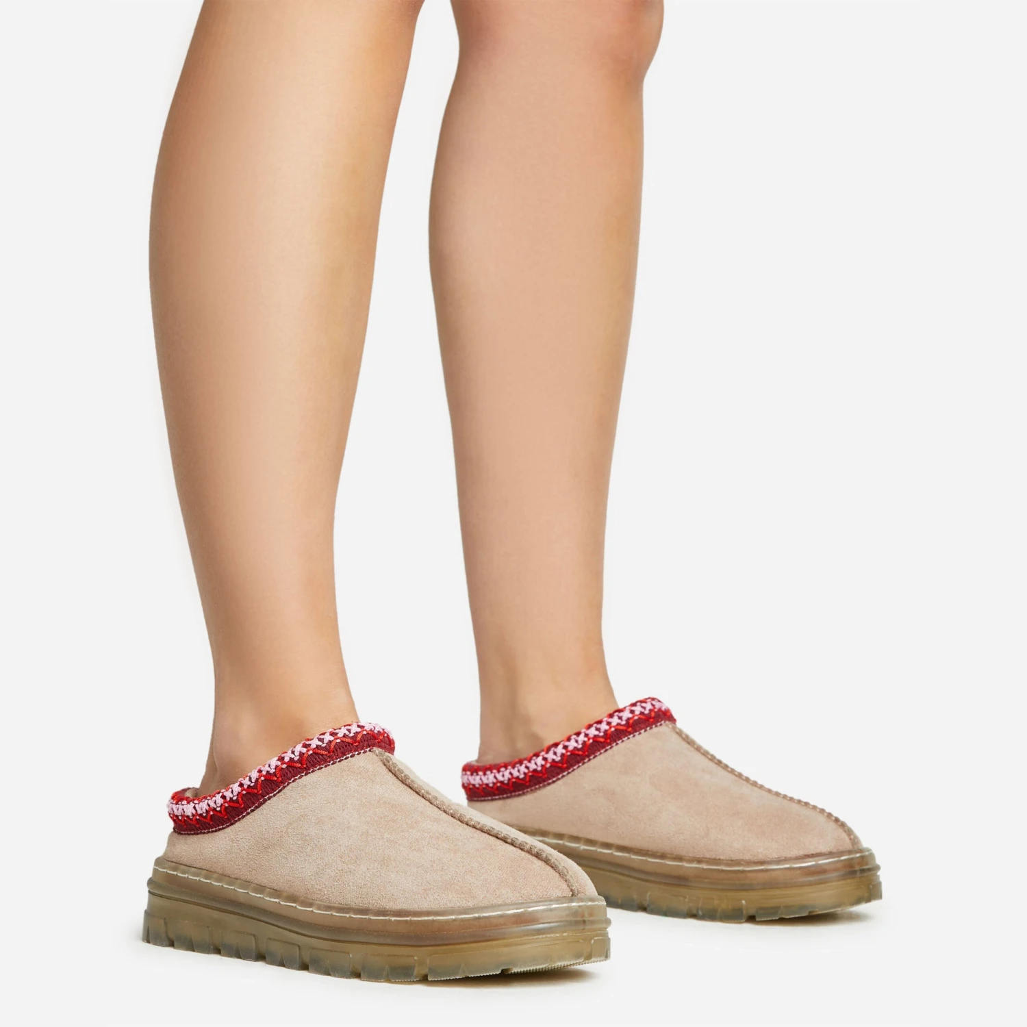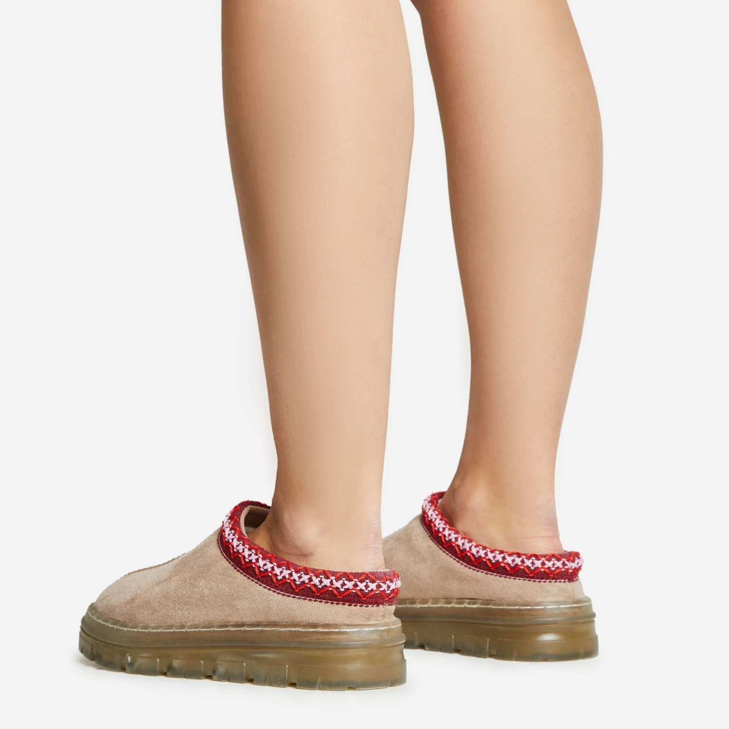 Your new season look just got an update with these flats doll. Featuring a taupe faux suede material, faux fur lining, a rubber sole and an aztec detailing.