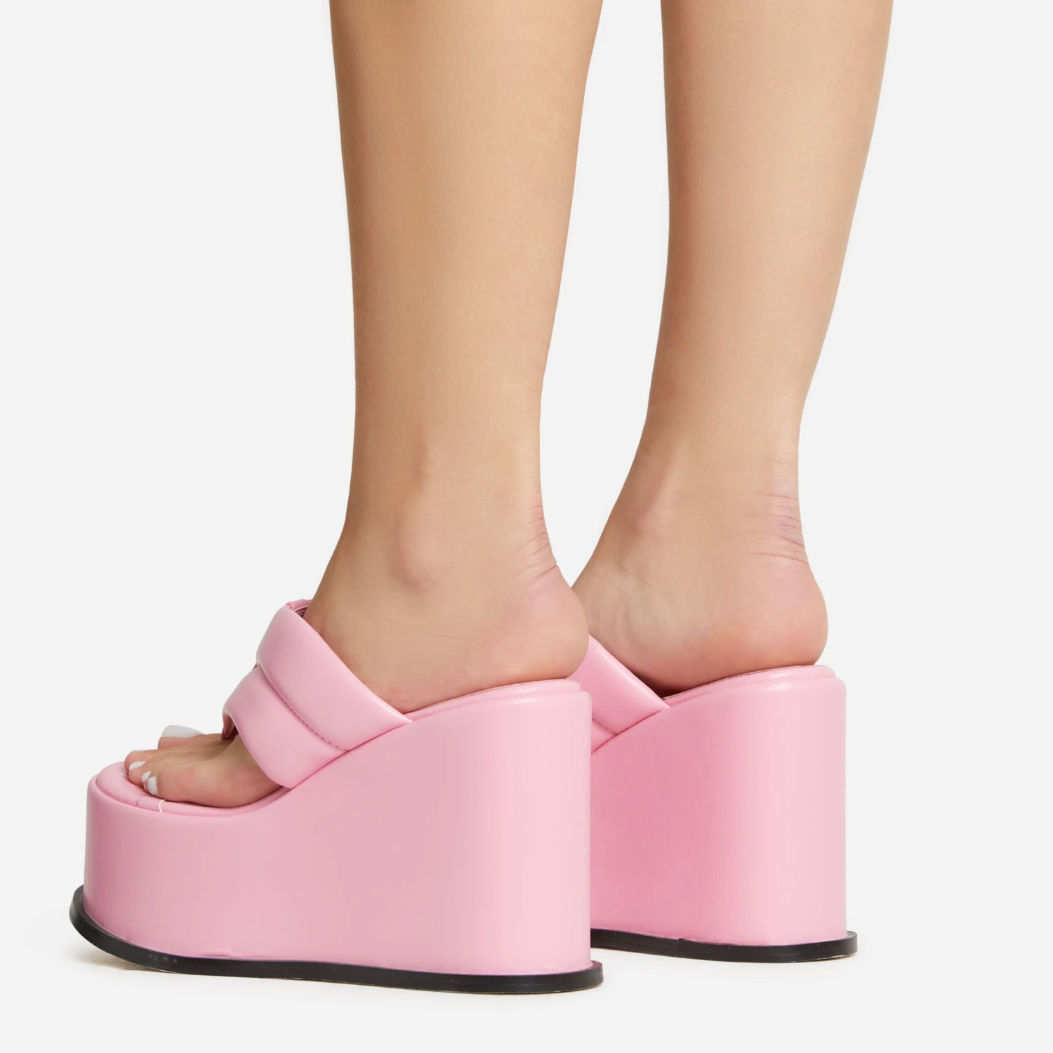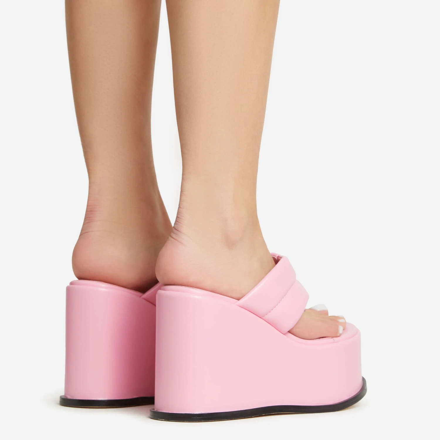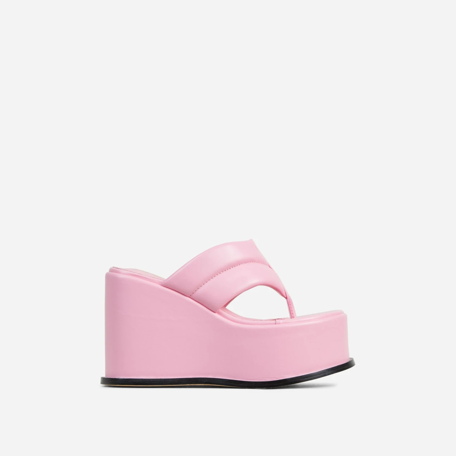 Step into the new season with these must have mules doll. Featuring a pink faux leather material, a padded thong strap, a platform wedge and a slip on fit.