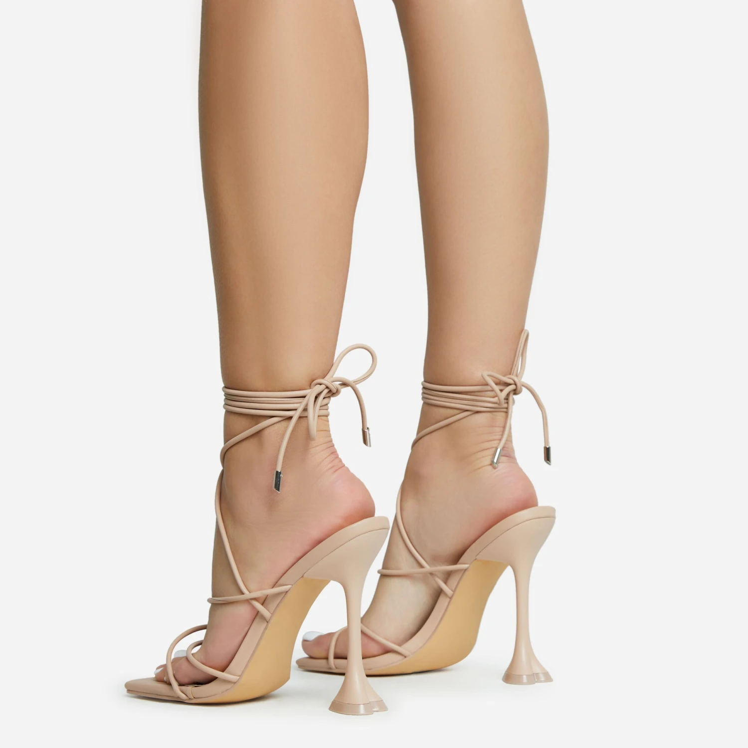 Dreamy neutral hues to complete your going out look. Featuring a nude faux leather material, with strappy detailing, a statement heel, square toe and a lace up finish.