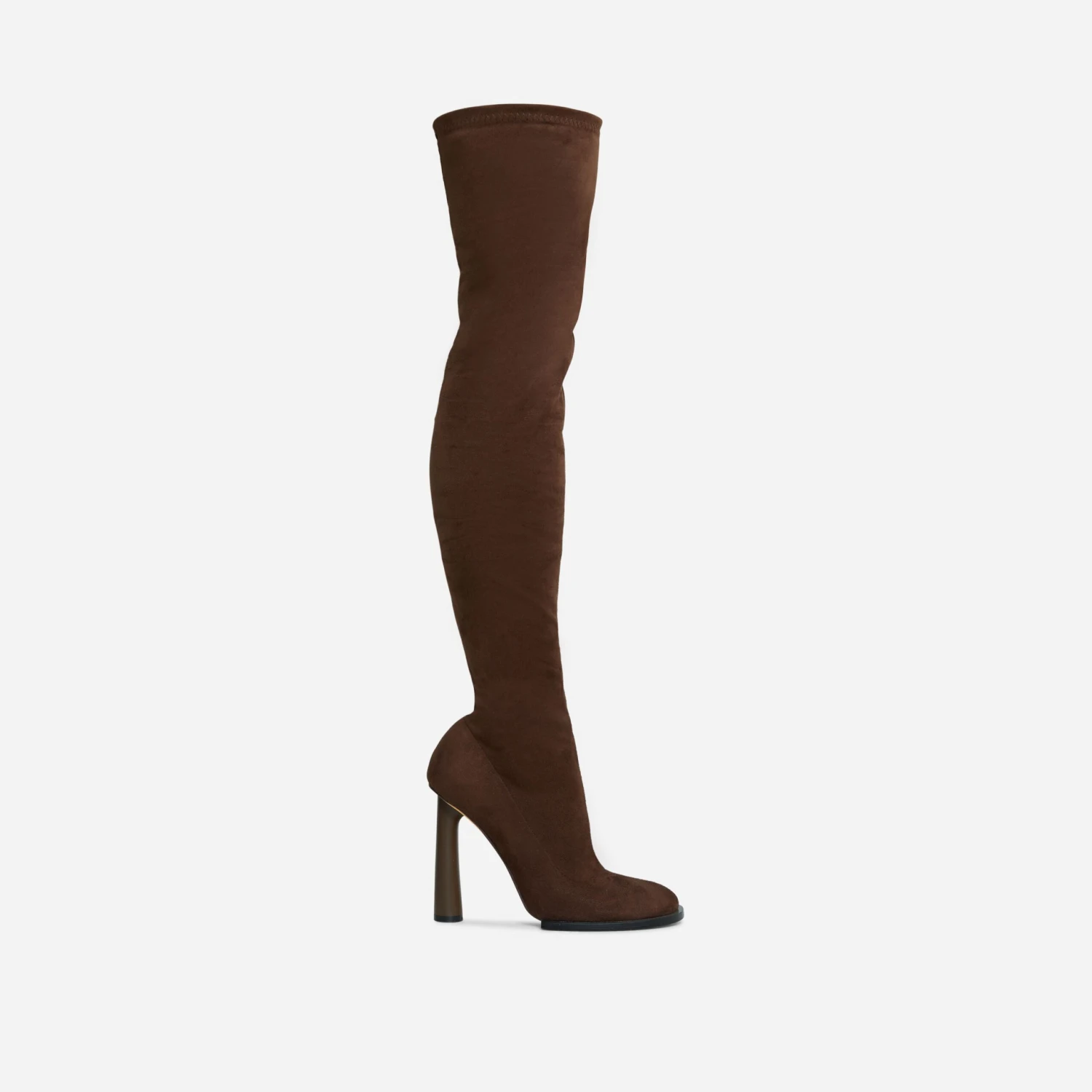 These boots are sure to earn you some serious style points girl. Featuring a brown faux suede material, a thigh high length and a round block heel.