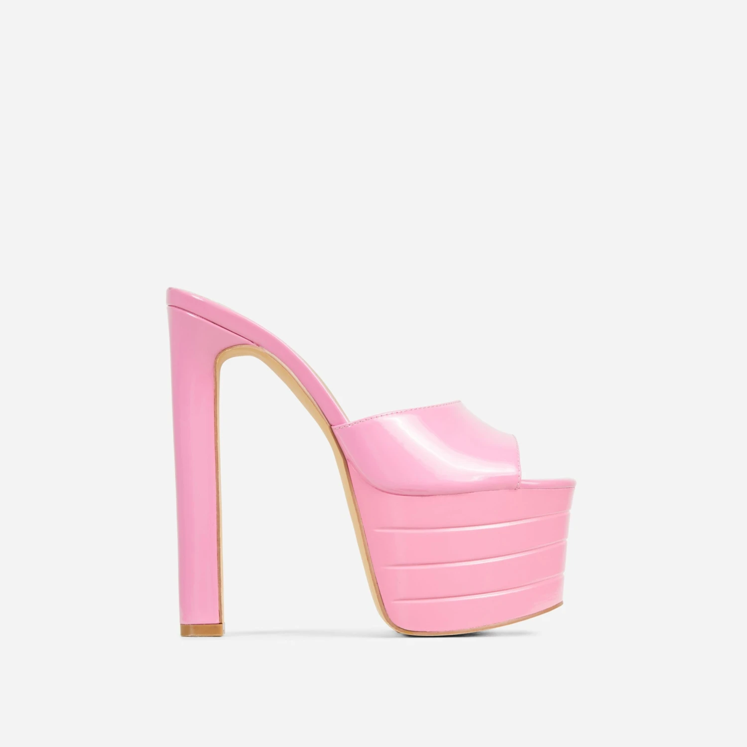 Add a boujee touch to your girls night out look doll. Featuring a pink patent material, with an extreme platform sole, a thin block heel, peep toe and a heel mule design.