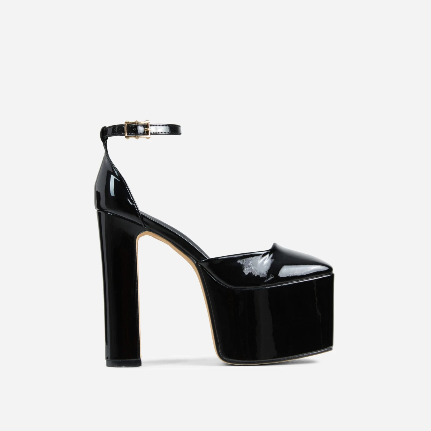 EGO Popped Ankle Strap Square Toe Platform Block Heel In Black Patent
