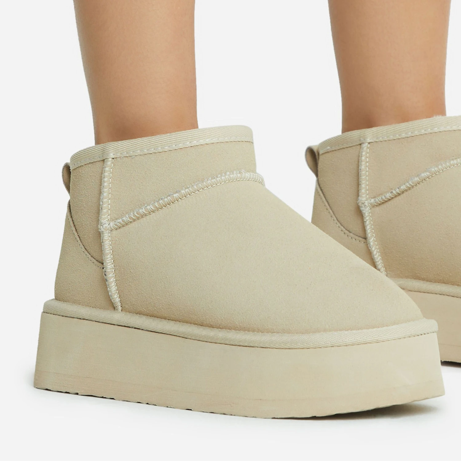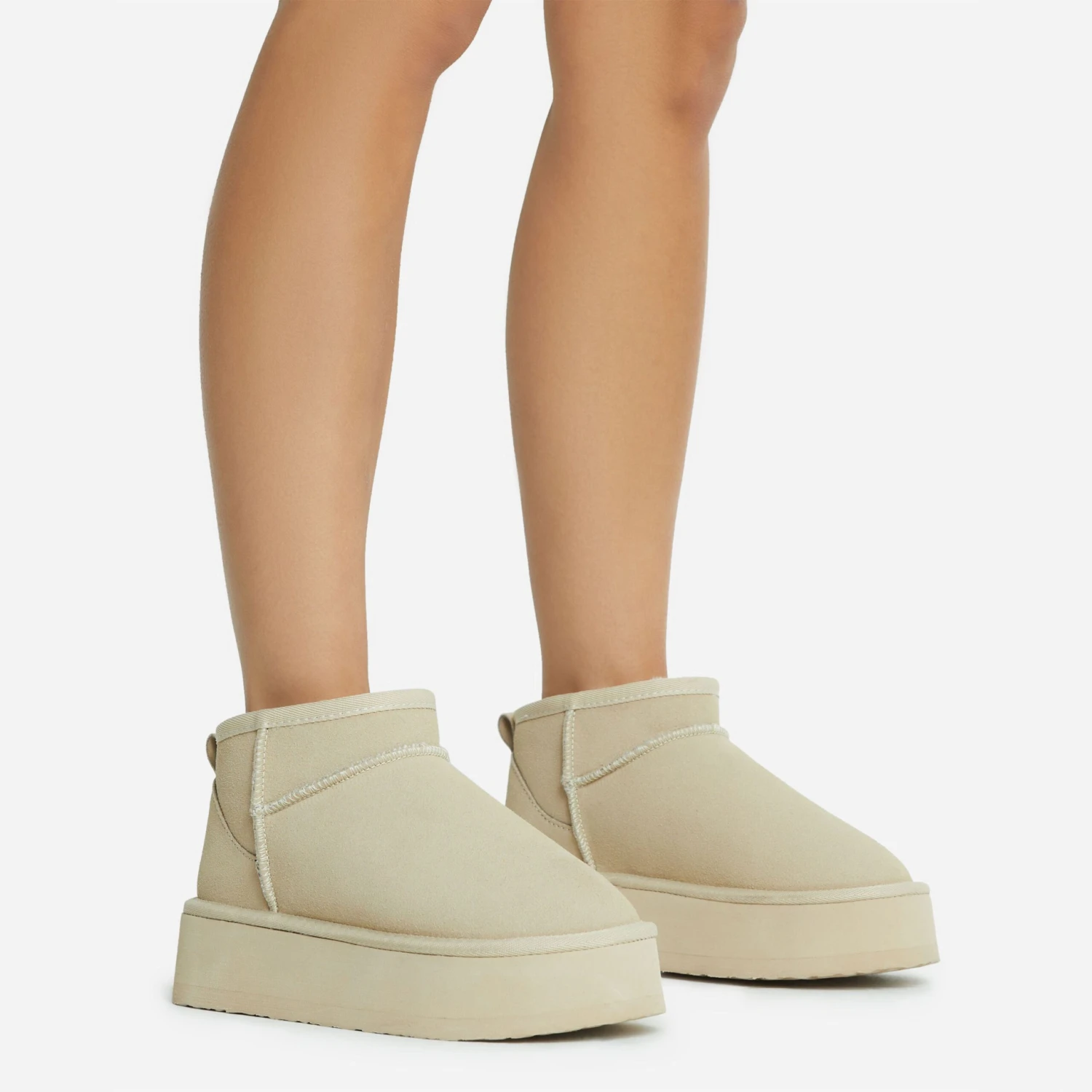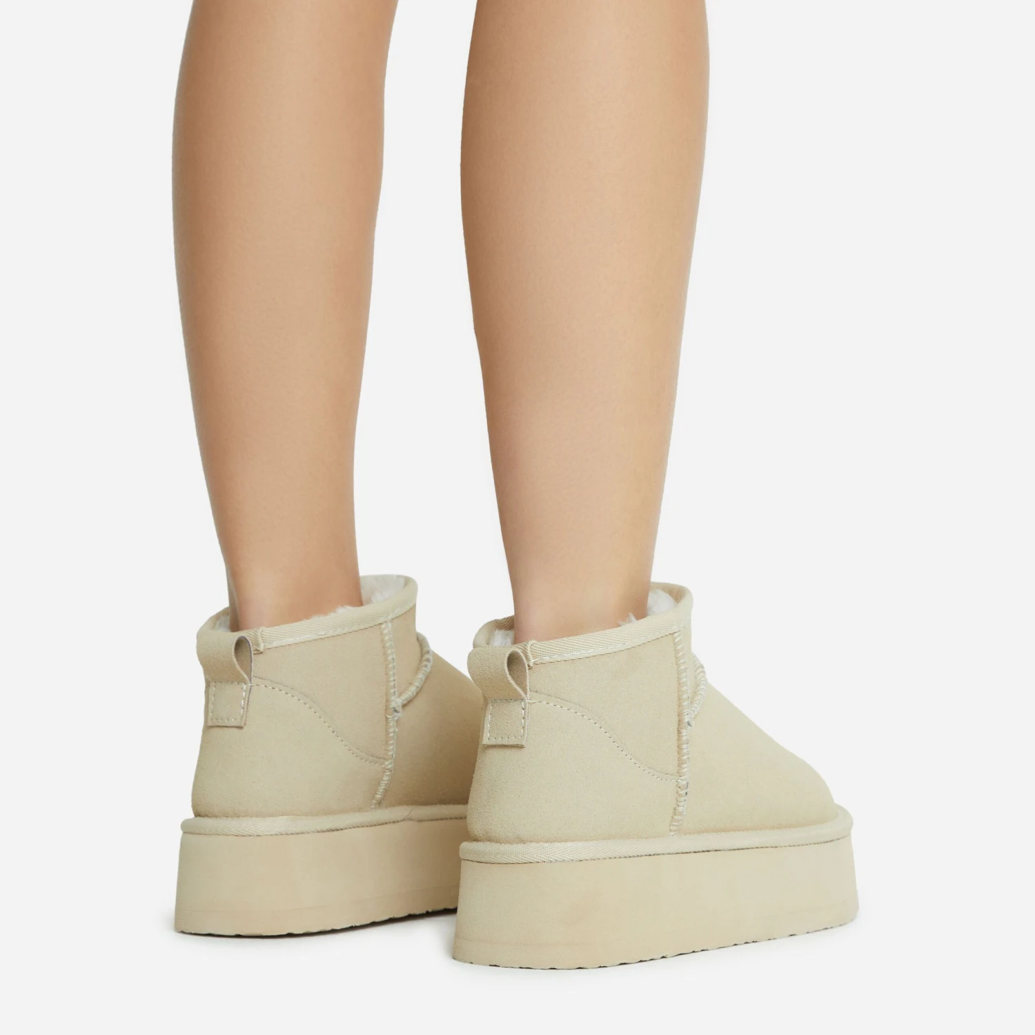 Dreamy neutral hues for your off-duty look doll. Featuring a beige faux suede material, with a platform sole and an ultra mini ankle length.