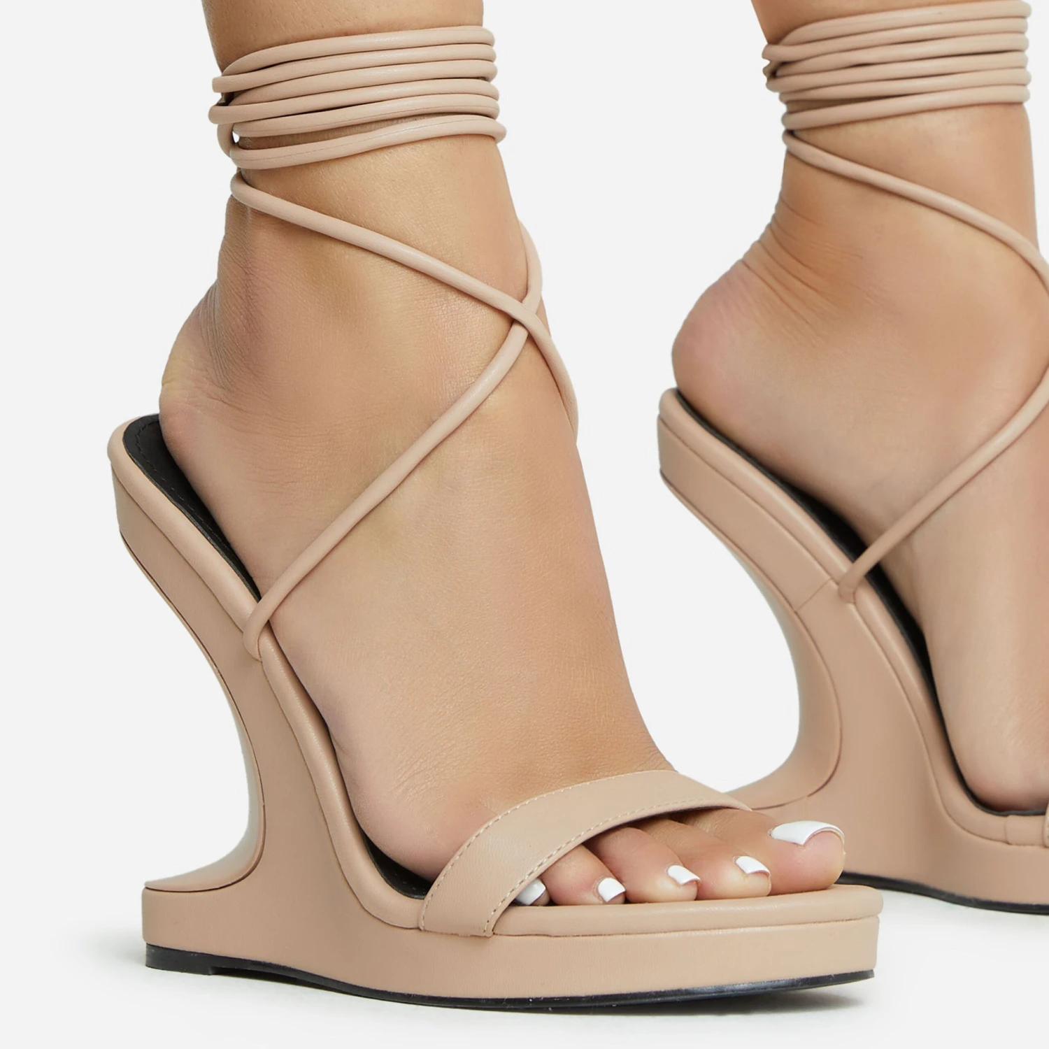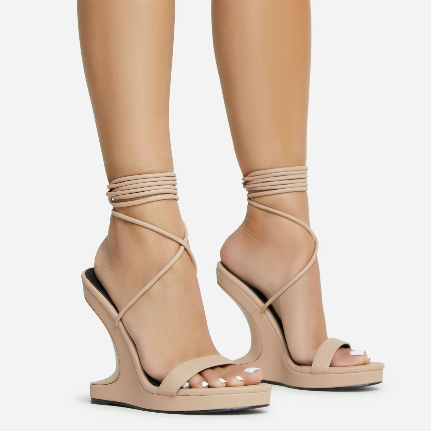 Dreamy neutral hues for your weekend look. Featuring a nude faux leather material, with a platform sole, a cut out wedge heel and a lace up finish.