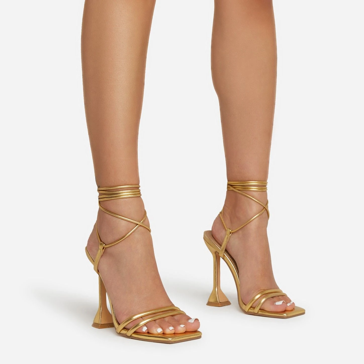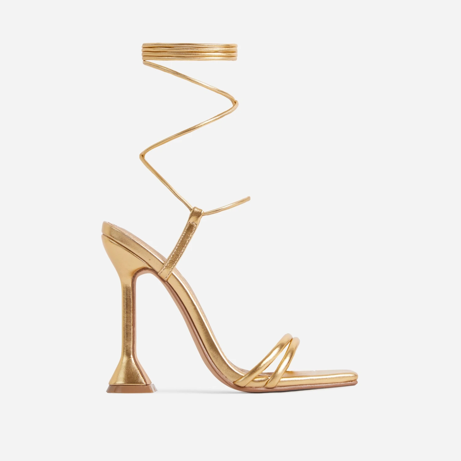 Update your new season look with these dreamy must-have heels. Featuring a gold faux leather material, with double strap detailing, a square toe, sculptured heel and a lace up finish.