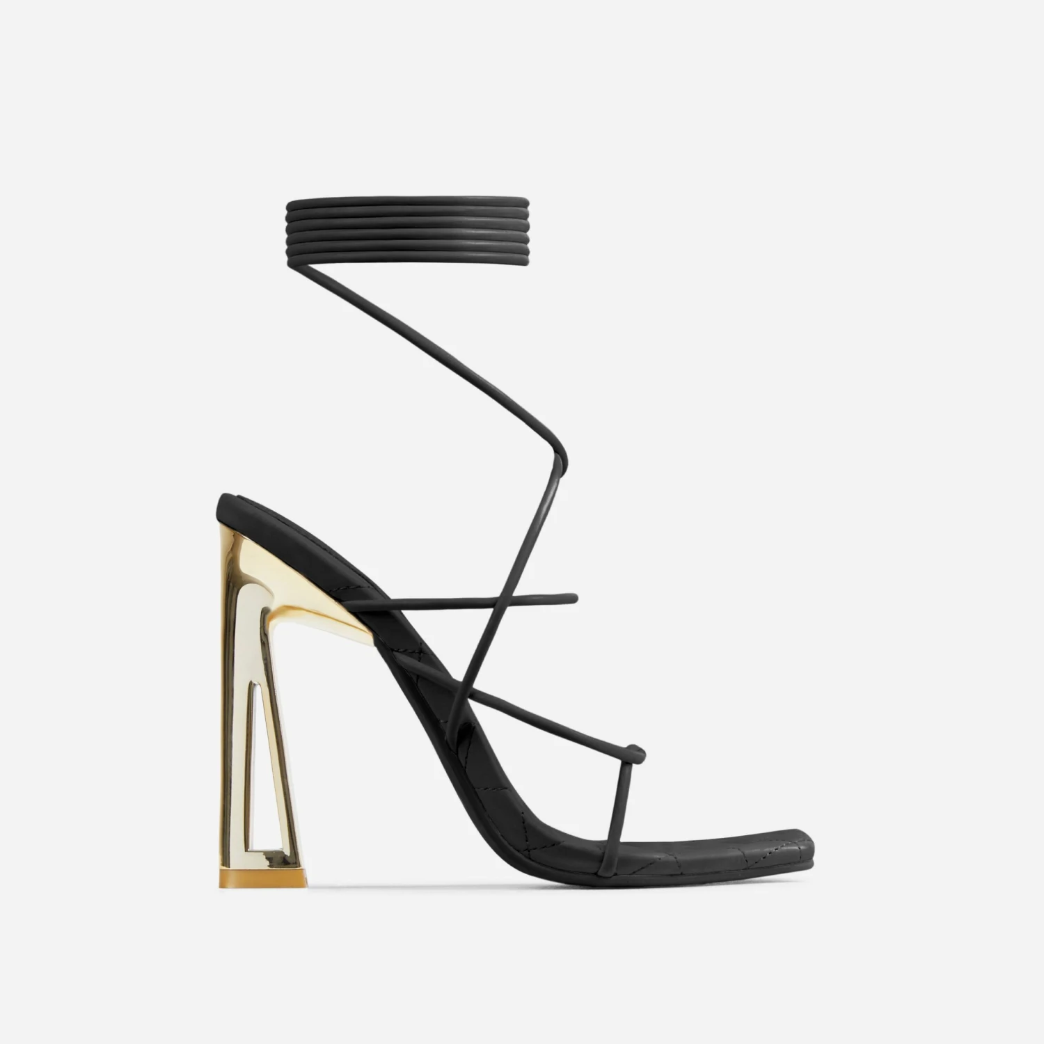 A girl can never have too many heels, right? Featuring a black faux leather material, with a quilted insole, a gold metallic cut out heel, a square toe and a lace up finish.