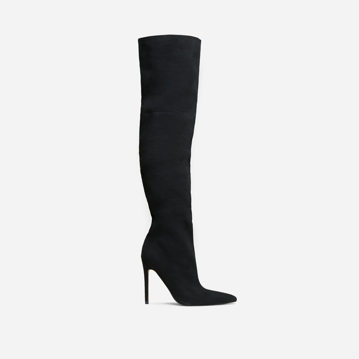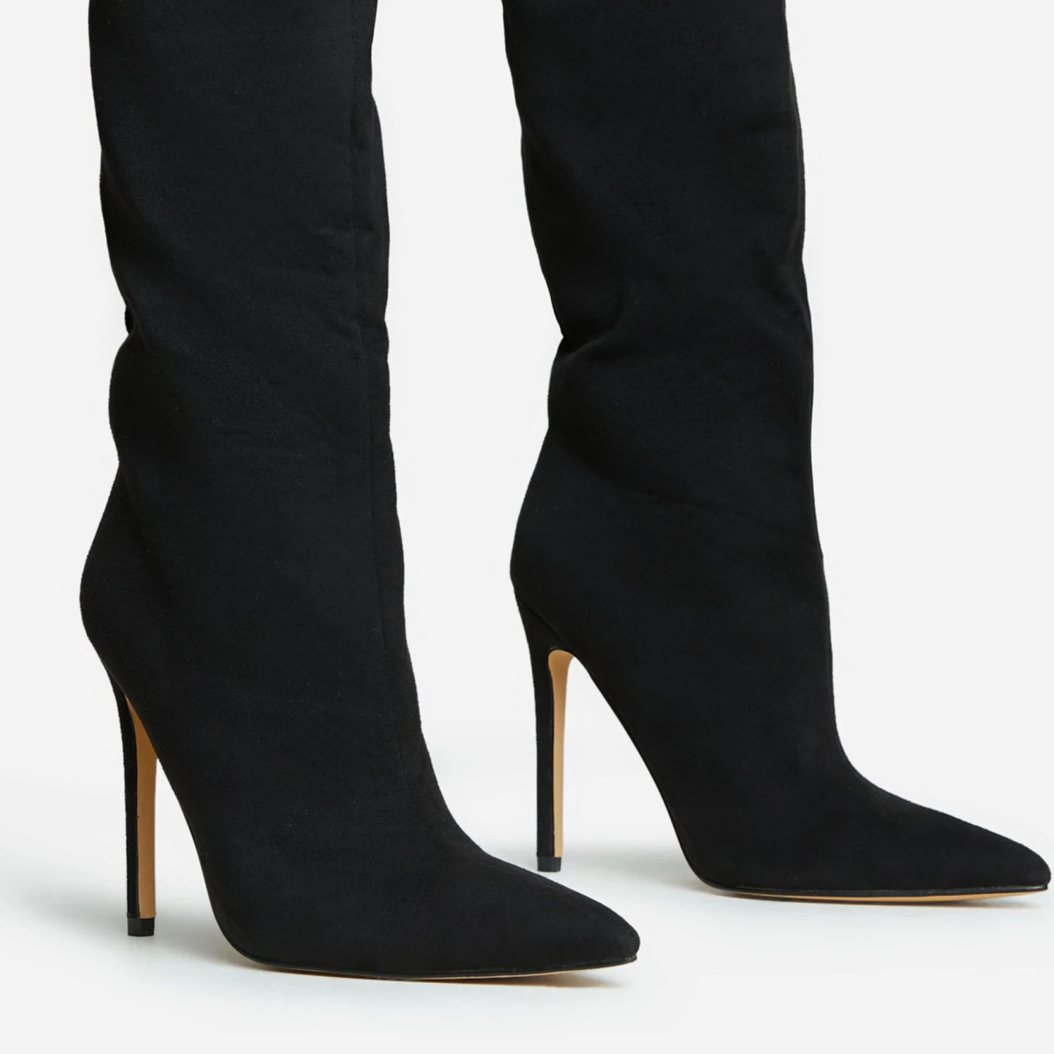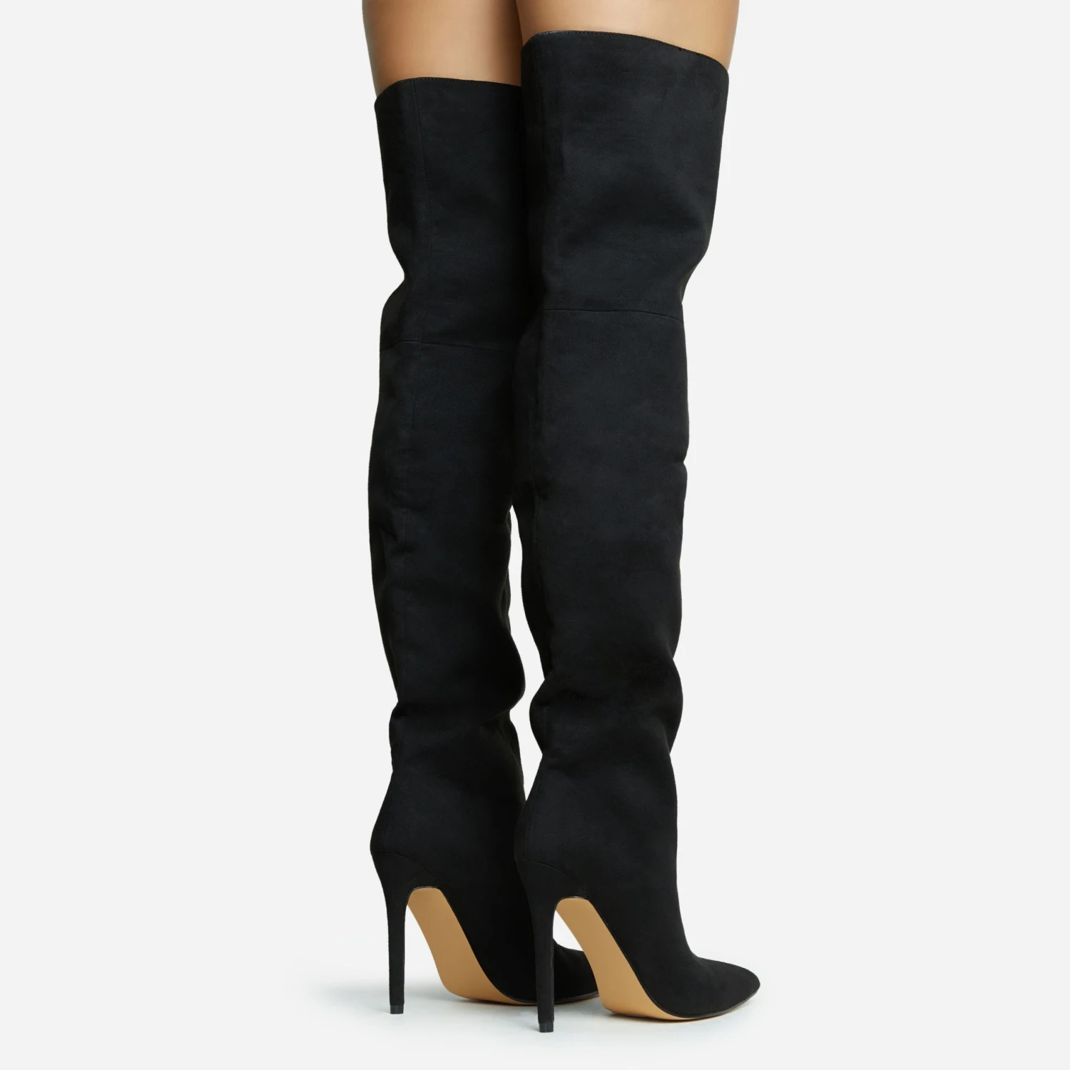 EGO Roux Pointed Toe Stiletto Heel Over The Knee Thigh High Long Slouch Boot In Black Faux Suede