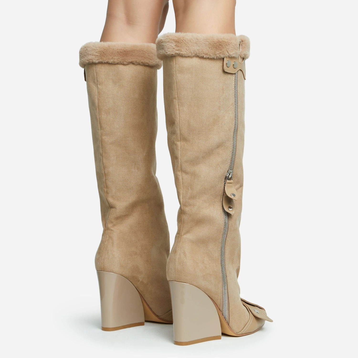 Update your must have boots collection doll. Featuring a beige faux fur and faux suede material, with buckle detailing, a wedge heel, square toe and an ankle length.