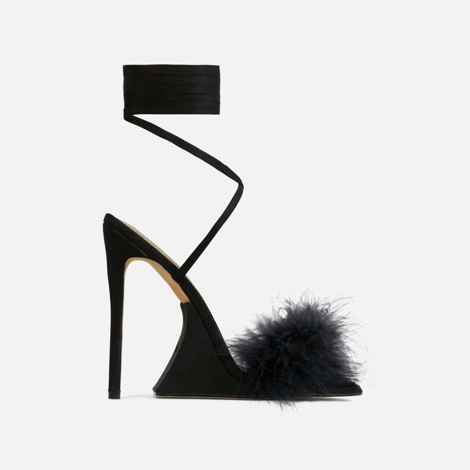 The ultimate heels for any special occasion just landed. Featuring a black faux suede material, with fluffy faux feather detailing, a sculptured platform sole, square toe, a stiletto heel and a lace up finish.