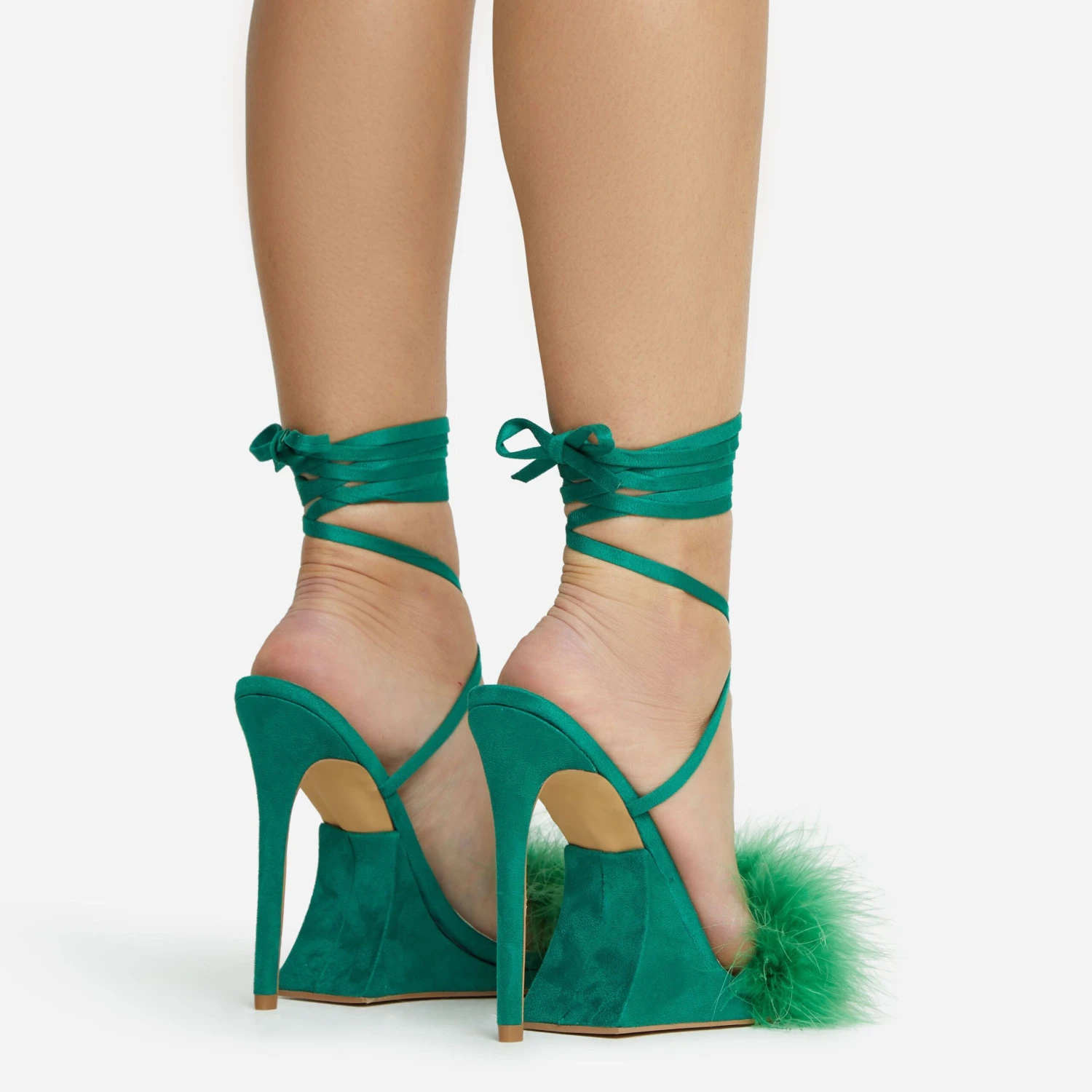 Say hello to your new party heels doll. Featuring a green faux suede material, with fluffy faux feather detailing, a sculptured platform sole, square toe, a stiletto heel and a lace up finish.