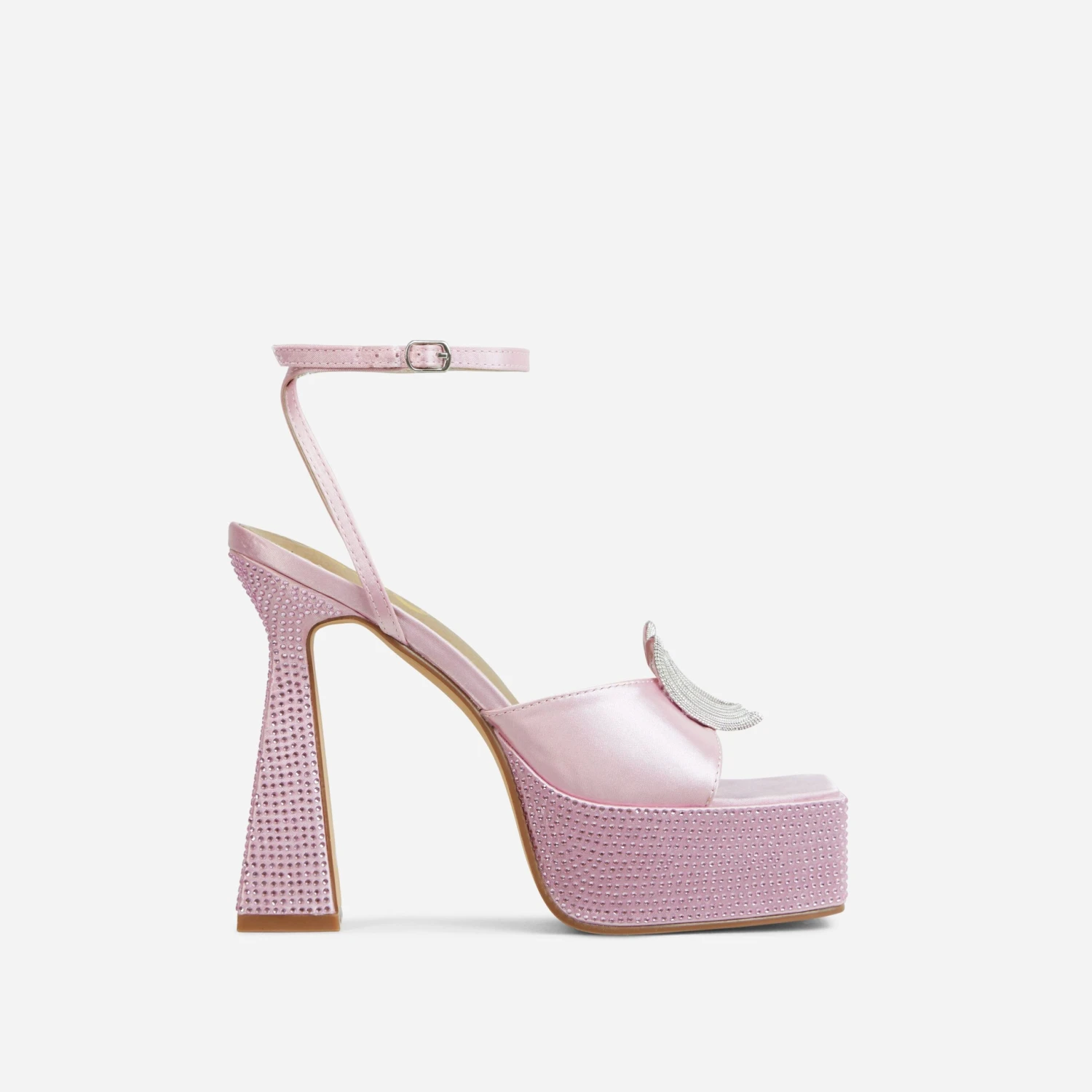 Heels fit for a boujee night out with the girls. Featuring a pink satin material, with diamante heart detailing, a square peep toe and a flared block heel.