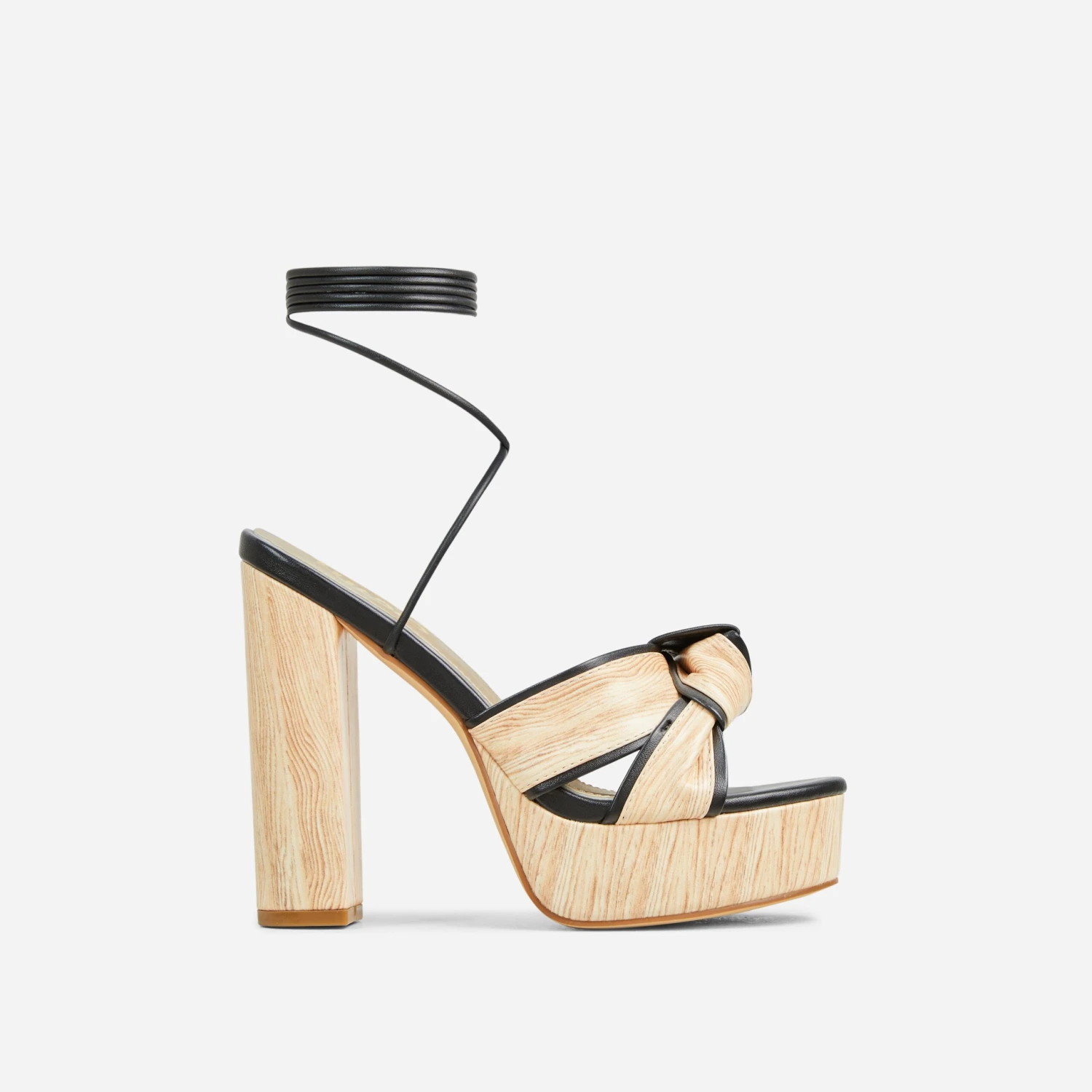 Amp up your brunch date look with these statement heels. Featuring a black faux leather material, with knotted strap detailing, a peep toe, wood effect platform block heel and a lace up finish.