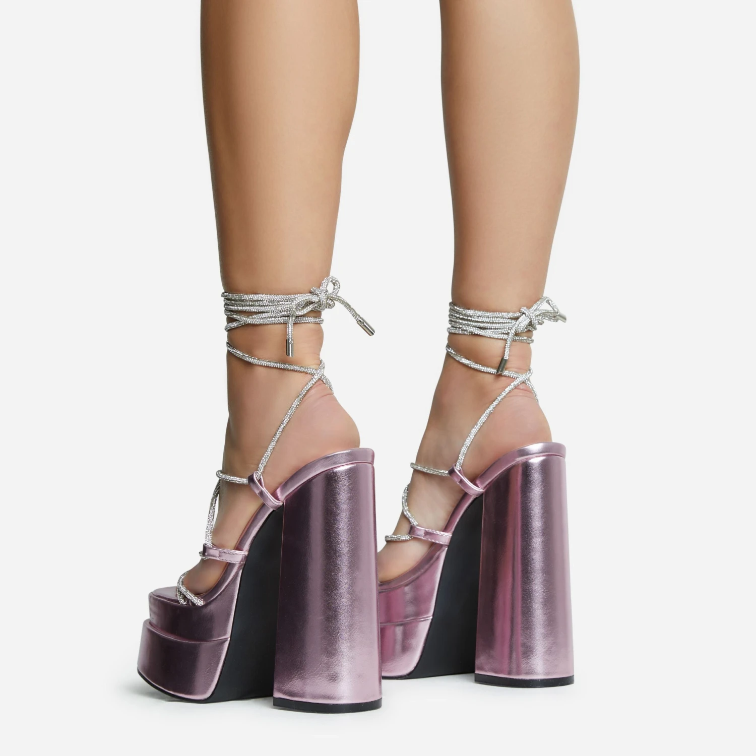 These heels are at the top of our hitlist girl. Featuring a pink metallic faux leather material, a lace-up design, diamante detailing and an extreme platform heel.