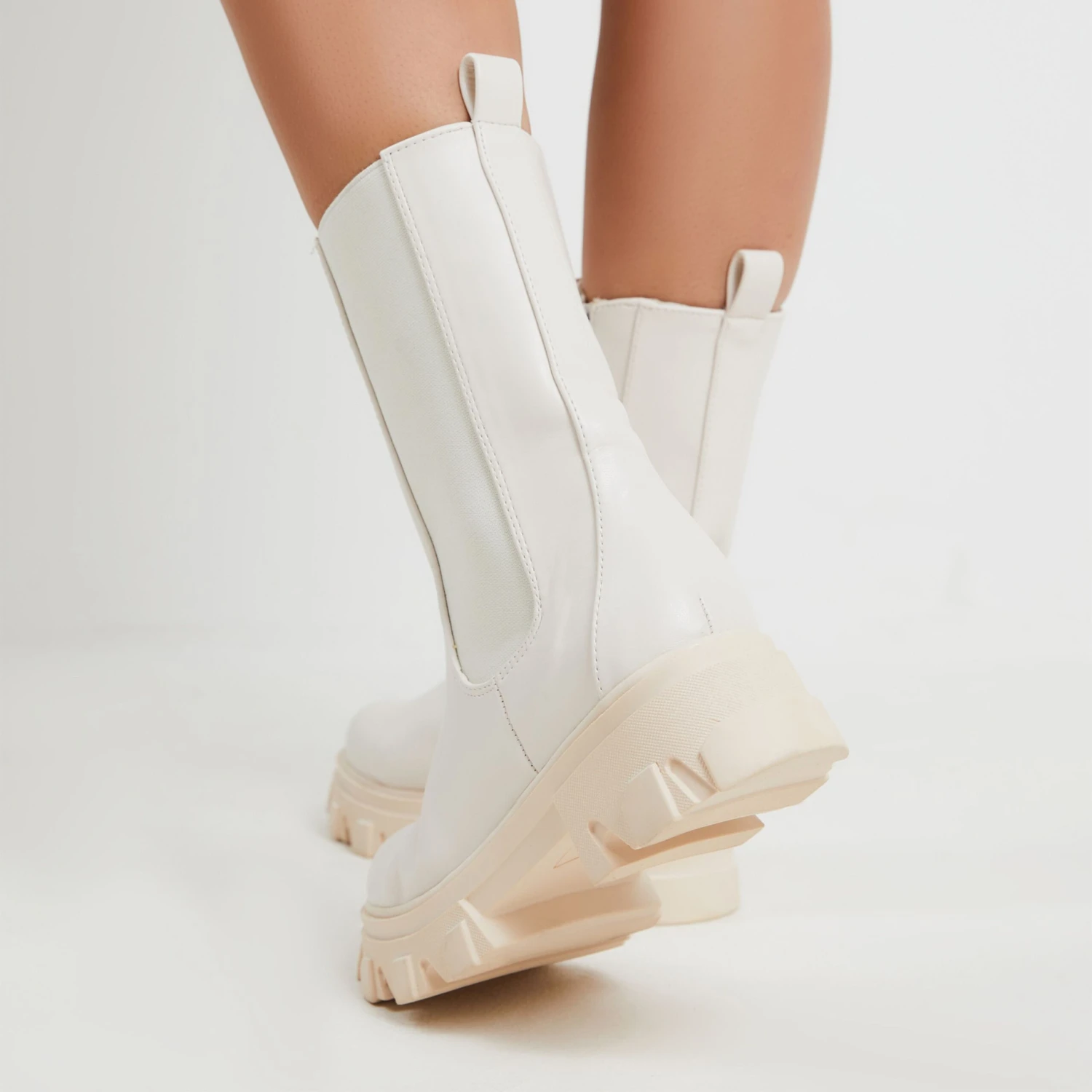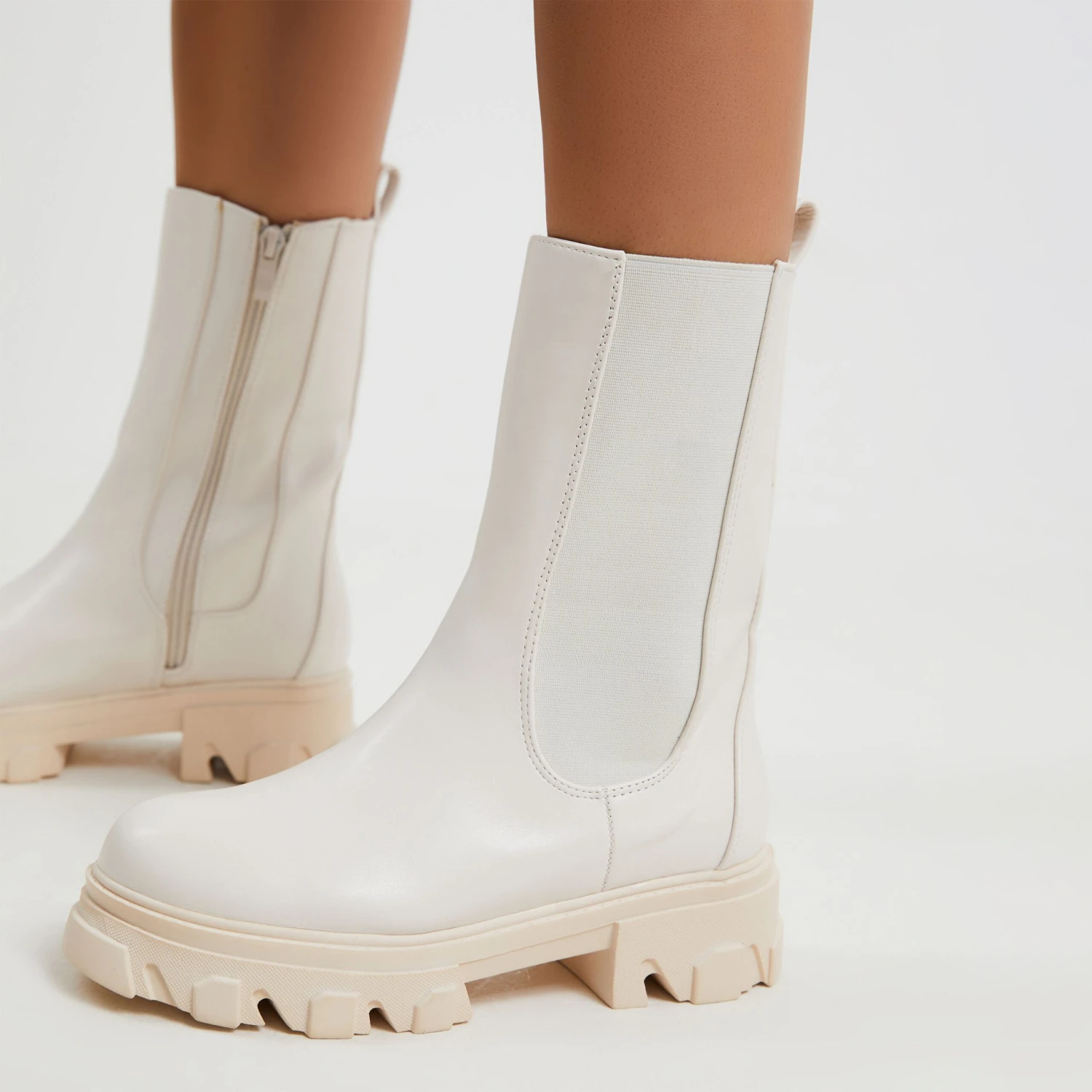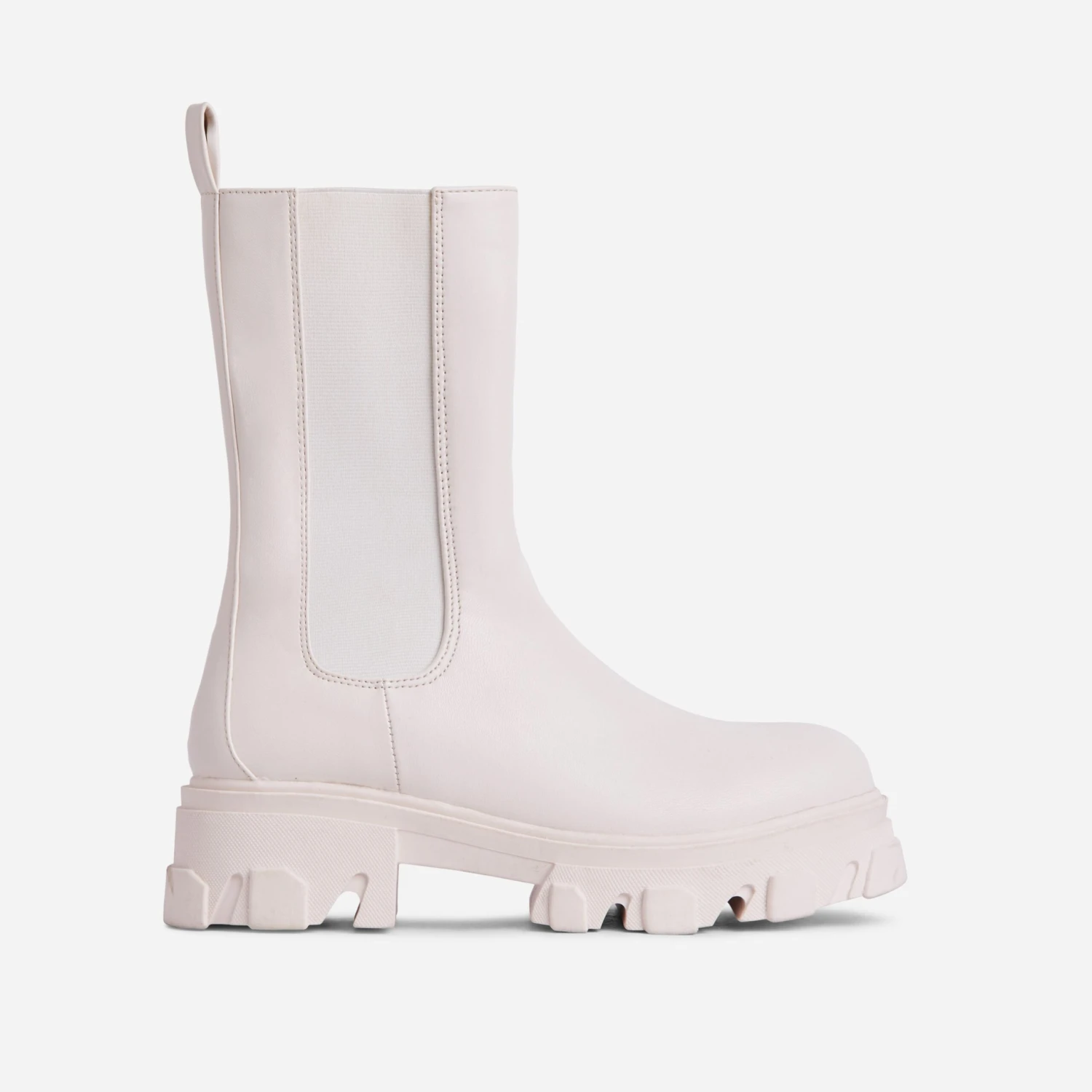 It is officially boots season and we are so excited. Featuring a nude faux leather material, with a chunky sole in an ankle Chelsea boot style.