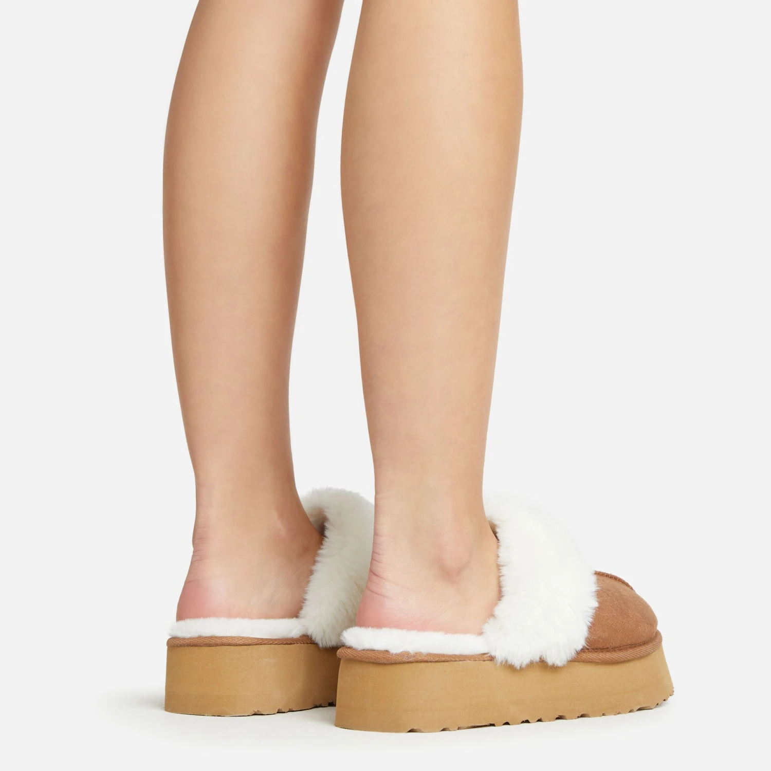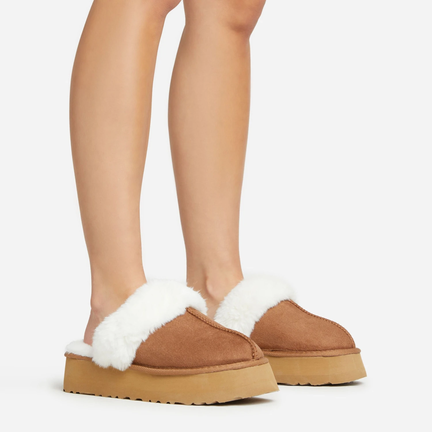 Having a girls night in? We’ve got your outfit covered. Featuring a chestnut brown faux suede material, with faux fur trim detailing, a platform sole and a slipper design.