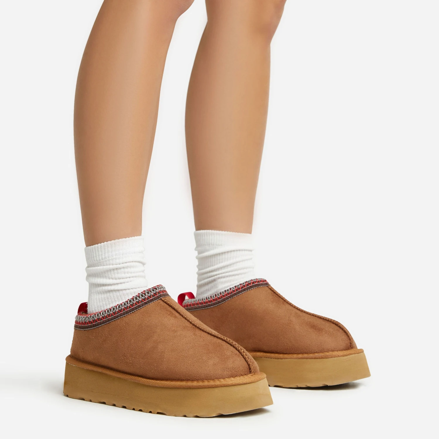 Girl, get that blogger-worthy look with these must haves. Featuring a chestnut faux suede material, with aztec detailing, faux fur lining, a platform sole and a slipper design.