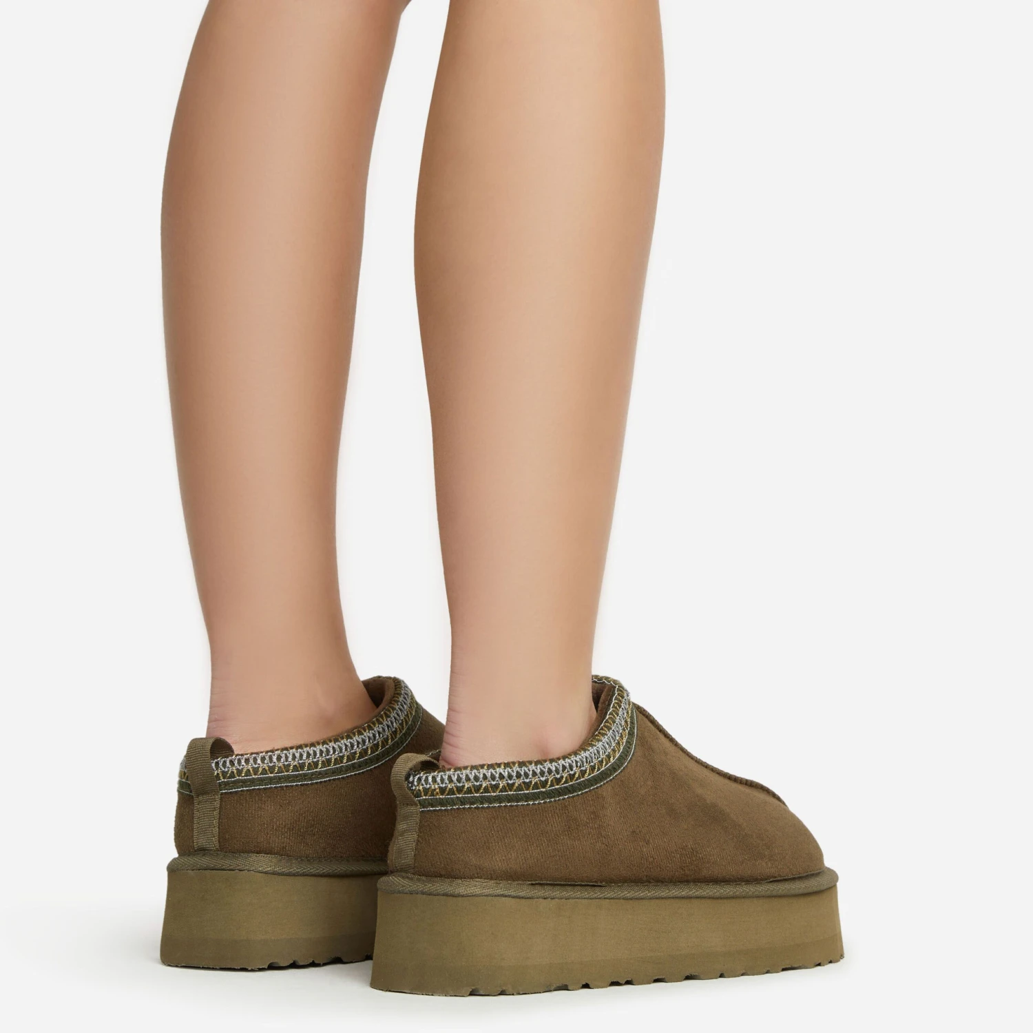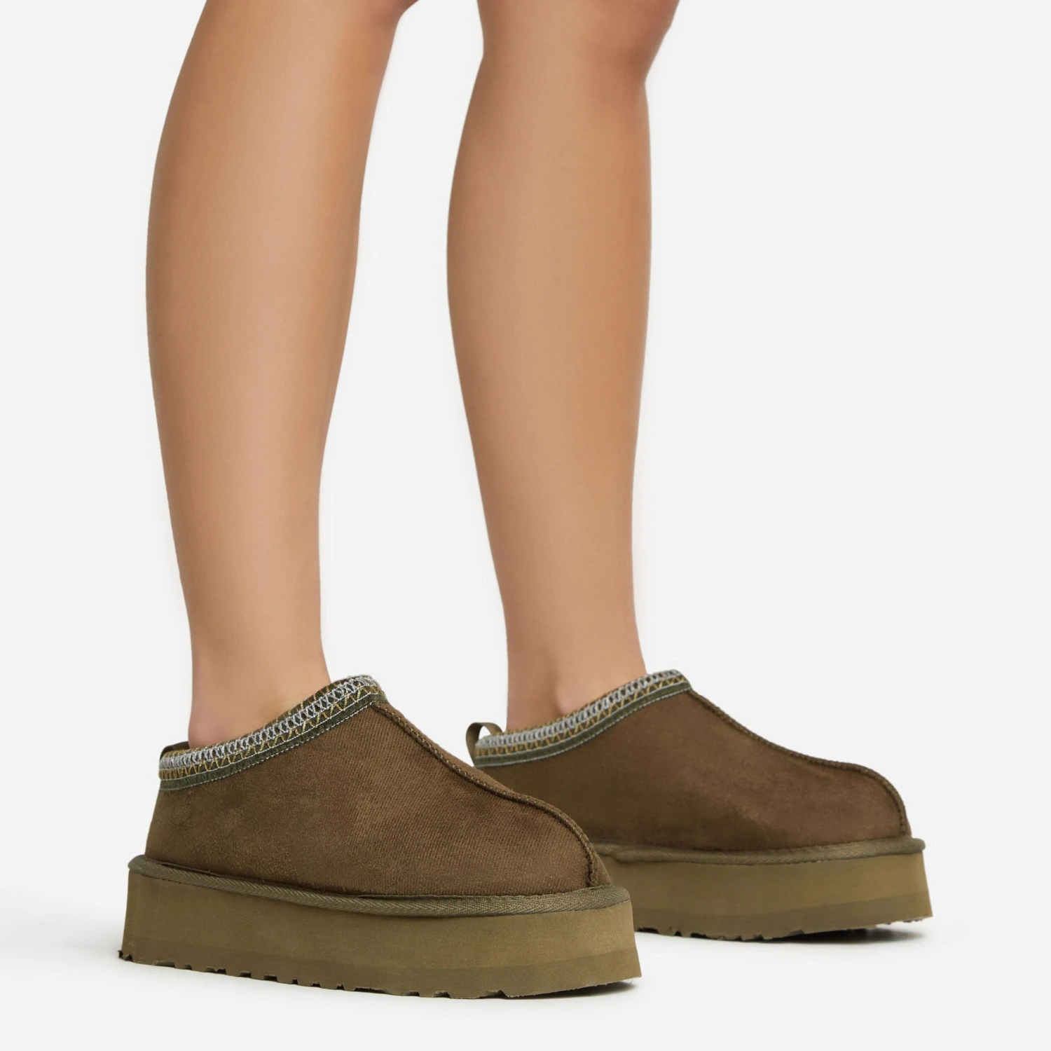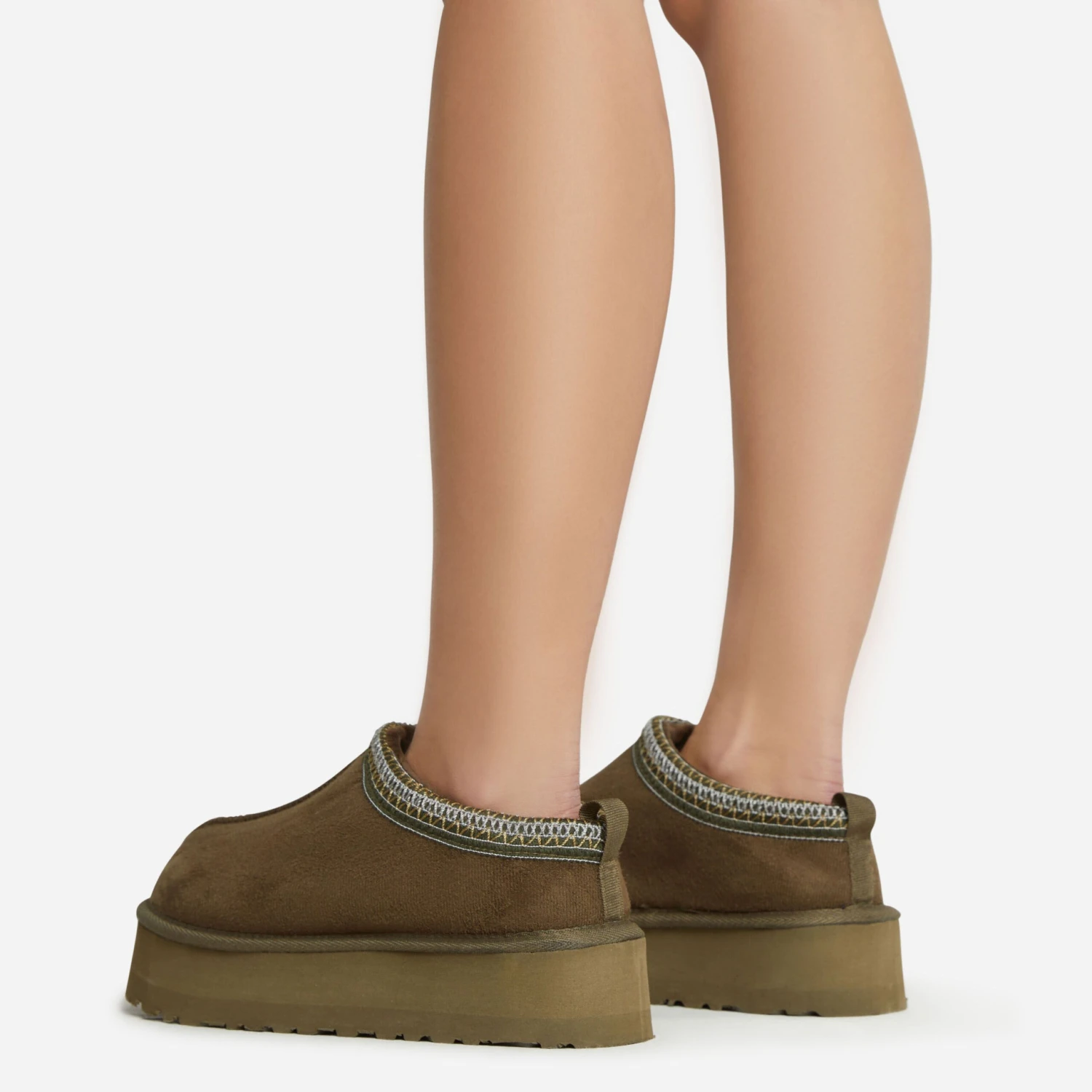 Get that ultimate blogger envy look. Featuring a green faux suede material, with aztec detailing, faux fur lining, a platform sole and a slip on slipper design.
