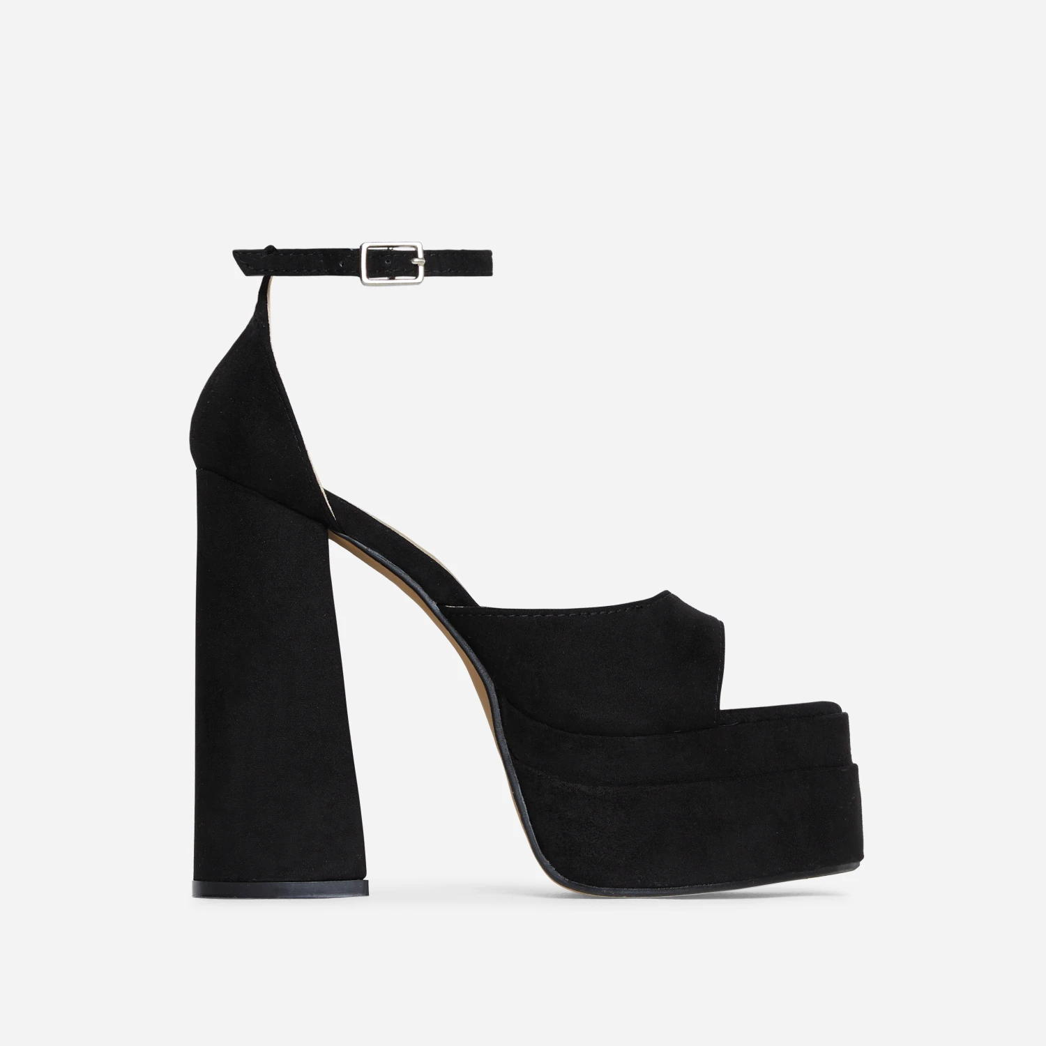 Girl, go extra always. Featuring a black satin material, with a double platform sole, a peep toe and a block heel.
