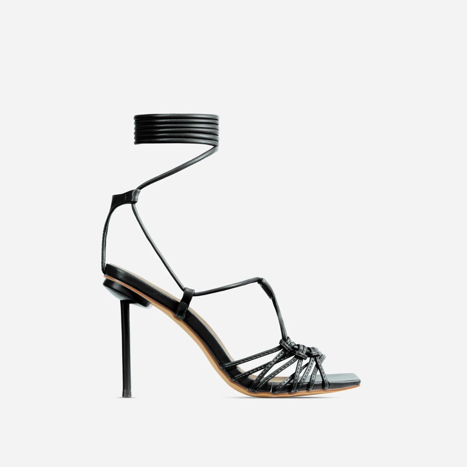 Brand new EGO just landed and we are obsessed. Featuring a black faux leather material, with knotted strap cage detailing, a square toe, thin stiletto heel and a lace up finish.