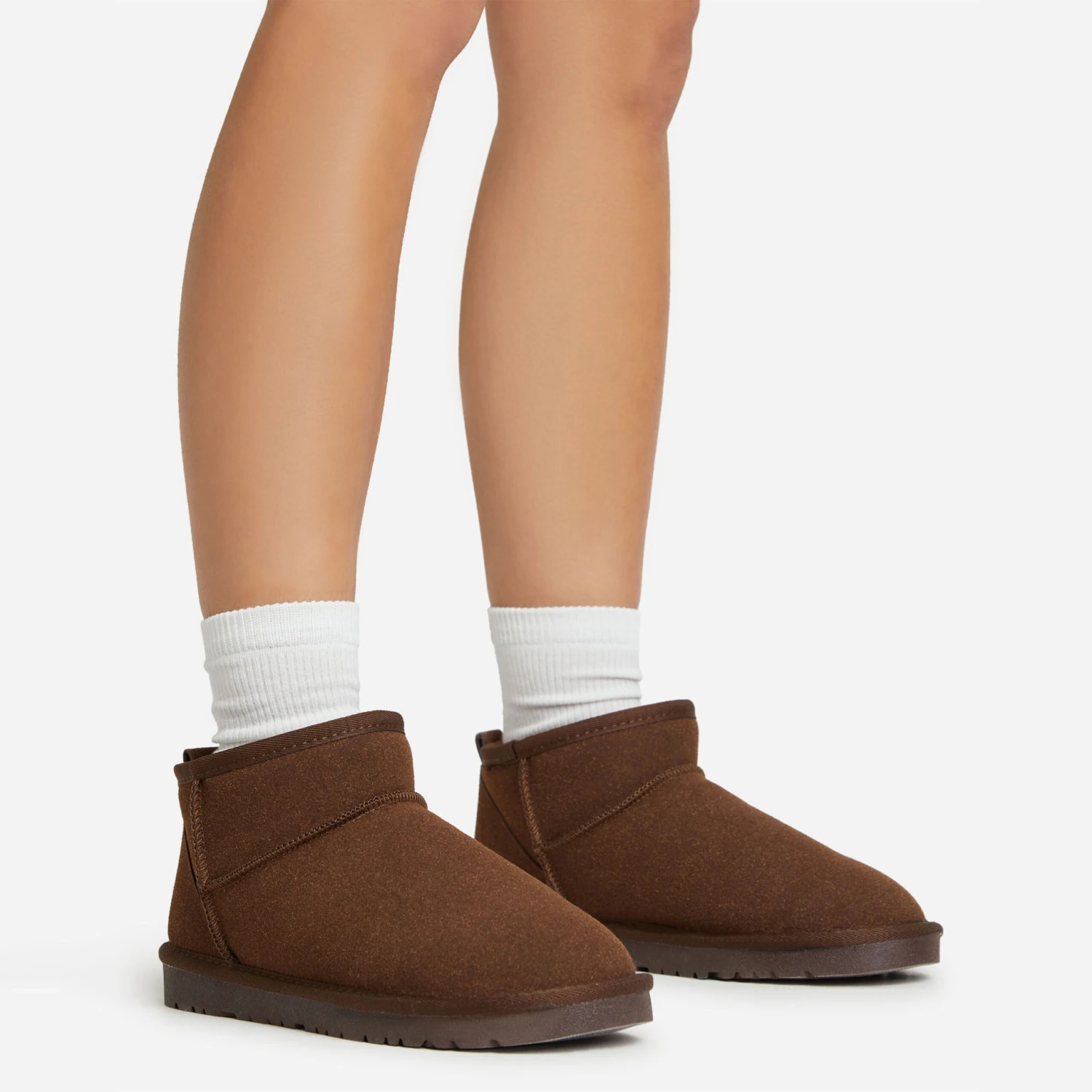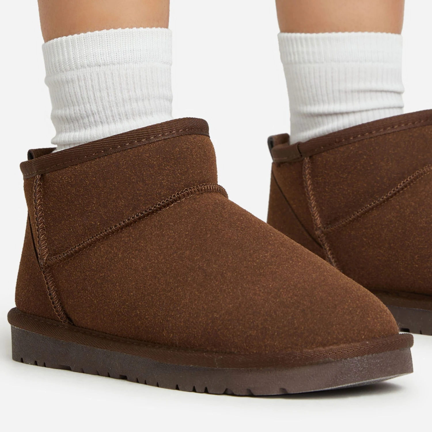 Get that blogger worthy look every girl is dreaming of. Featuring a dark brown faux suede material, with faux fur lining and an ultra mini ankle length.